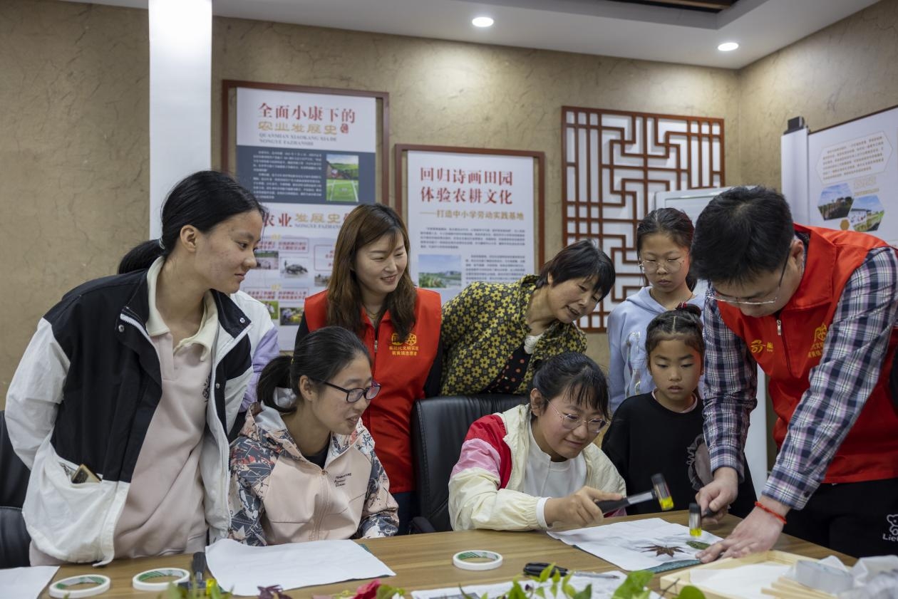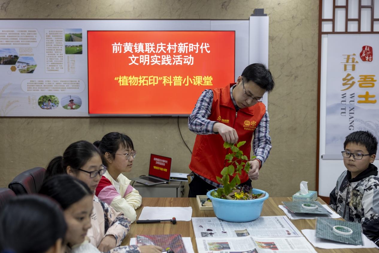 为弘扬拓染传统文化,体验传承非遗技能,4月15日,常州大学美术与设计学院研究生志愿者们与联庆村村委在武进区前黄镇联庆村新时代文明实践站共同开展了“植物拓印”科普小课堂乡村美育研学实践活动。联庆村的小朋友和当地小学的学生参与美育研学小课堂。