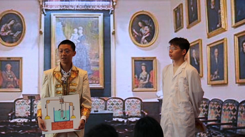 课程教师殷开梁介绍了课堂剧的创作背景。他指出,发现、分析、解决问题的过程非常重要,希望同学们在这个过程中培养科学素养和科学精神、学会如何思考。同学们在深入查找资料的基础上,将文字内容转化为人物语言、动作、神情等辅助舞台和旁白,进行了生动的表演。剧中搭配西欧服饰道具和舞台背景,让迈尔、焦耳等科学家“活”起来、“动”起来,通过话剧的形式生动演绎了热力学第一定律的发展过程,带来了一场跨越古今的对话。身临其境的演绎让同学们体验到了科学的发展充满艰辛和困苦,也体会到了其中的科学家精神。