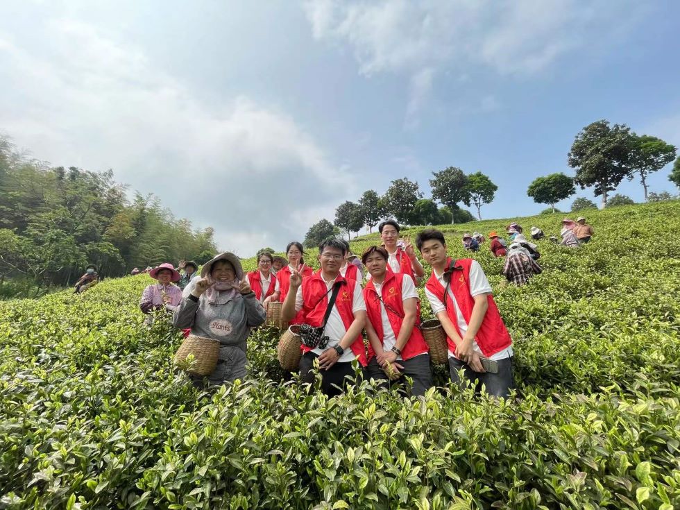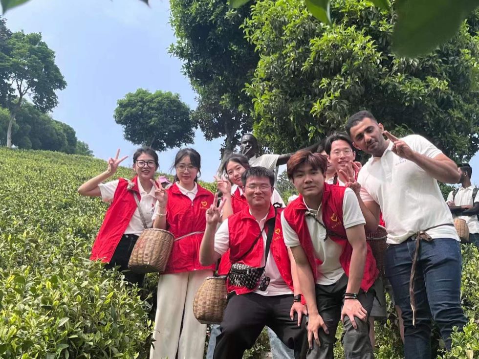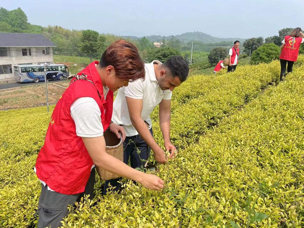 “我们要采摘的是牙尖的茶叶,像这样用指腹轻轻折下,不能用指甲掐,不然会影响茶的品质。”在正式采摘前,中外大学生志愿者们在茶农的现场示范和讲解下,很快掌握了采茶要领,逐渐进入了茶农劳作的角色.他们身着红马甲穿梭于茶树之间,为这片绿意盎然的生态茶园增添了一道靓丽的风景线。
