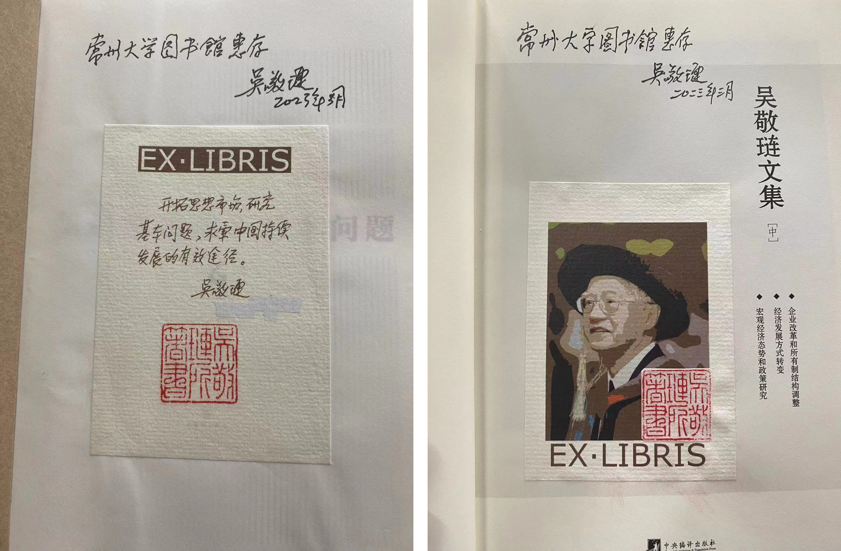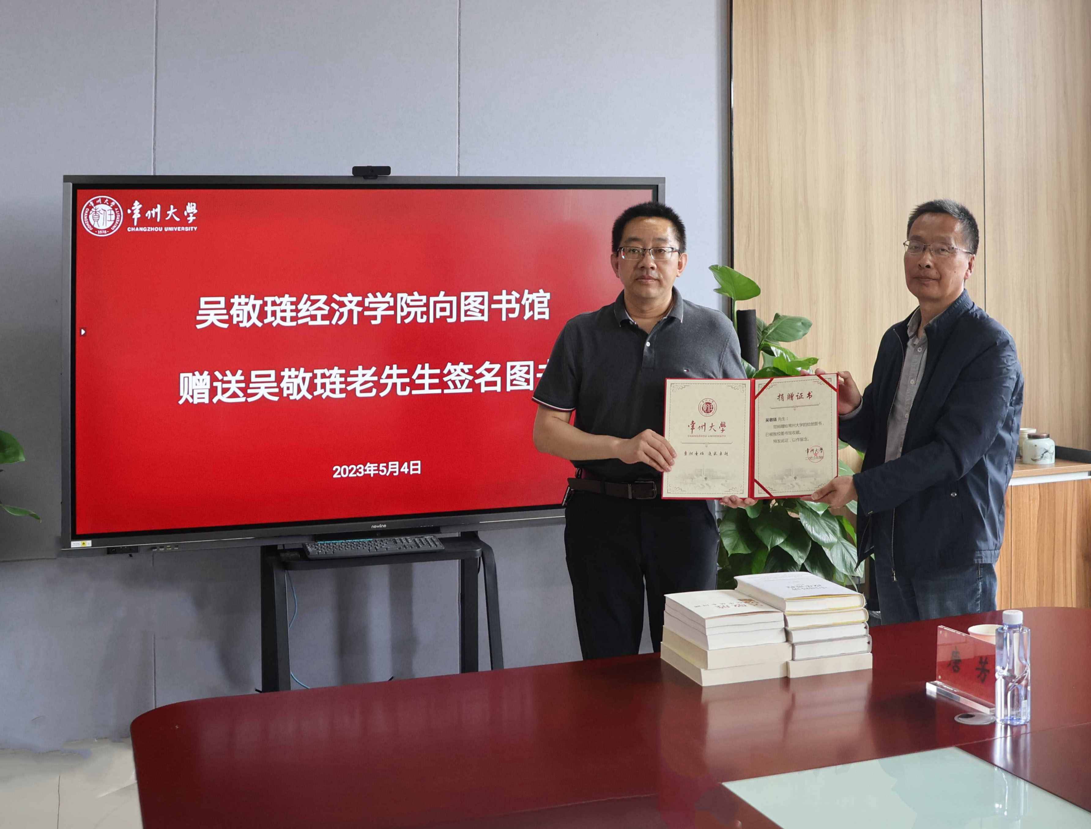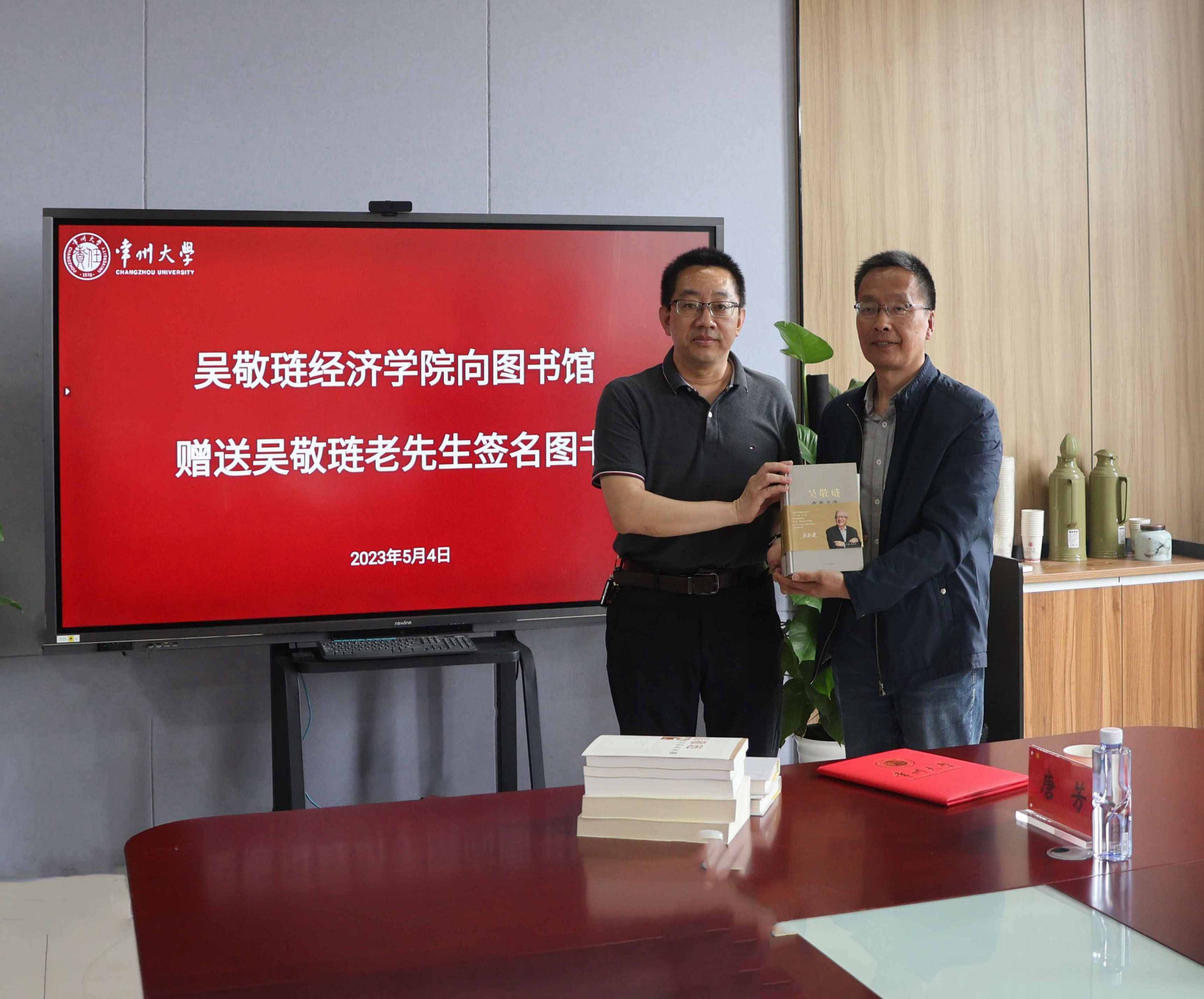 姜国刚代表吴敬琏先生向图书馆赠送签名图书,金耀代表图书馆接受捐赠并颁发捐赠证书。吴敬琏先生是我国著名经济学家,祖籍为江苏省常州市,受聘为经济学院名誉院长。吴敬琏先生捐赠的图书有《吴敬琏文集》《吴敬琏讼改革基本问题》《吴敬琏改革文选》和《中国经济改革进程》等,是吴敬琏先生多年来在经济学领域的著作,具有极高的学术价值,每本书的扉页上都有吴敬琏先生的亲笔签名,承载着吴敬琏先生的深厚情感。这些专著丰富了我校图书馆经济类图书资源,为我校经济学科的教学和研究提供了强大的理论指导。