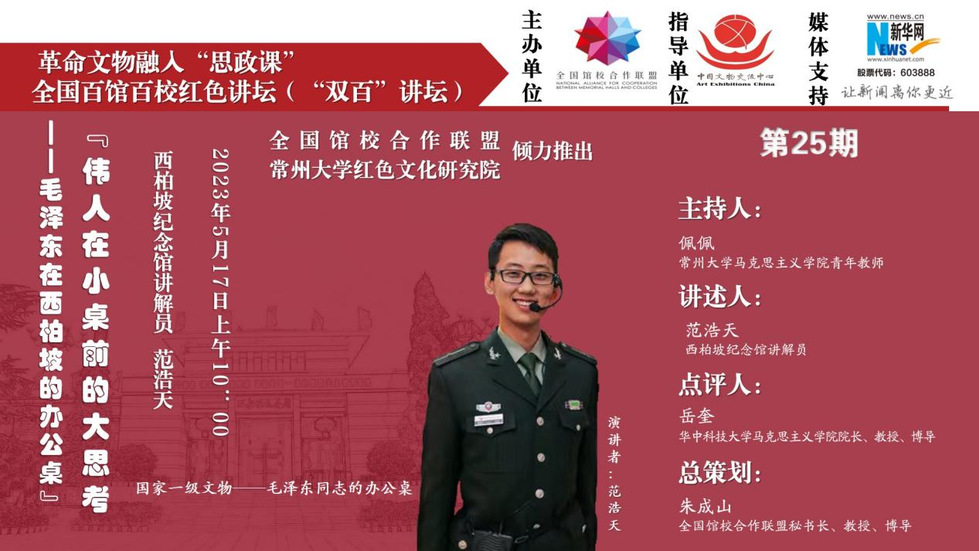 5月17日,为推动用好用活革命文物工作,由全国馆校合作联盟主办,中国文物交流中心指导,常州大学马克思主义学院、常州大学红色文化研究院联袂推出“革命文物融入‘思政课’全国百馆百校红色讲坛”(简称“‘双百’讲坛”)第25期网络课程活动。本期邀请西柏坡纪念馆讲解员范浩天担任讲述人,华中科技大学马克思主义学院院长岳奎教授担任点评人。来自全国馆校合作联盟理事单位的常州大学、华中科技大学、北京高校思政中心、常州大学怀德学院、西柏坡纪念馆、抗美援朝纪念馆等高校部分师生及博物馆人,通过线上方式参加活动。全国馆校合作联盟秘书长、常州大学红色文化研究院院长朱成山教授总策划活动,常州大学青年教师汪佩主持活动。