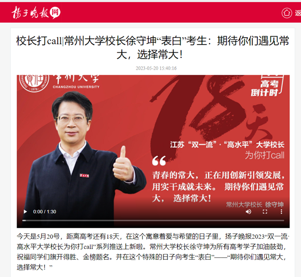 今天是5月20号,距离高考还有18天,在这个寓意着爱与希望的日子里,扬子晚报2023“双一流·高水平大学校长为你打call”系列推送上新啦。常州大学校长徐守坤为所有高考学子加油鼓劲,祝福同学们旗开得胜、金榜题名。并在这个特殊的日子向考生“表白”——“期待你们遇见常大,选择常大!”
