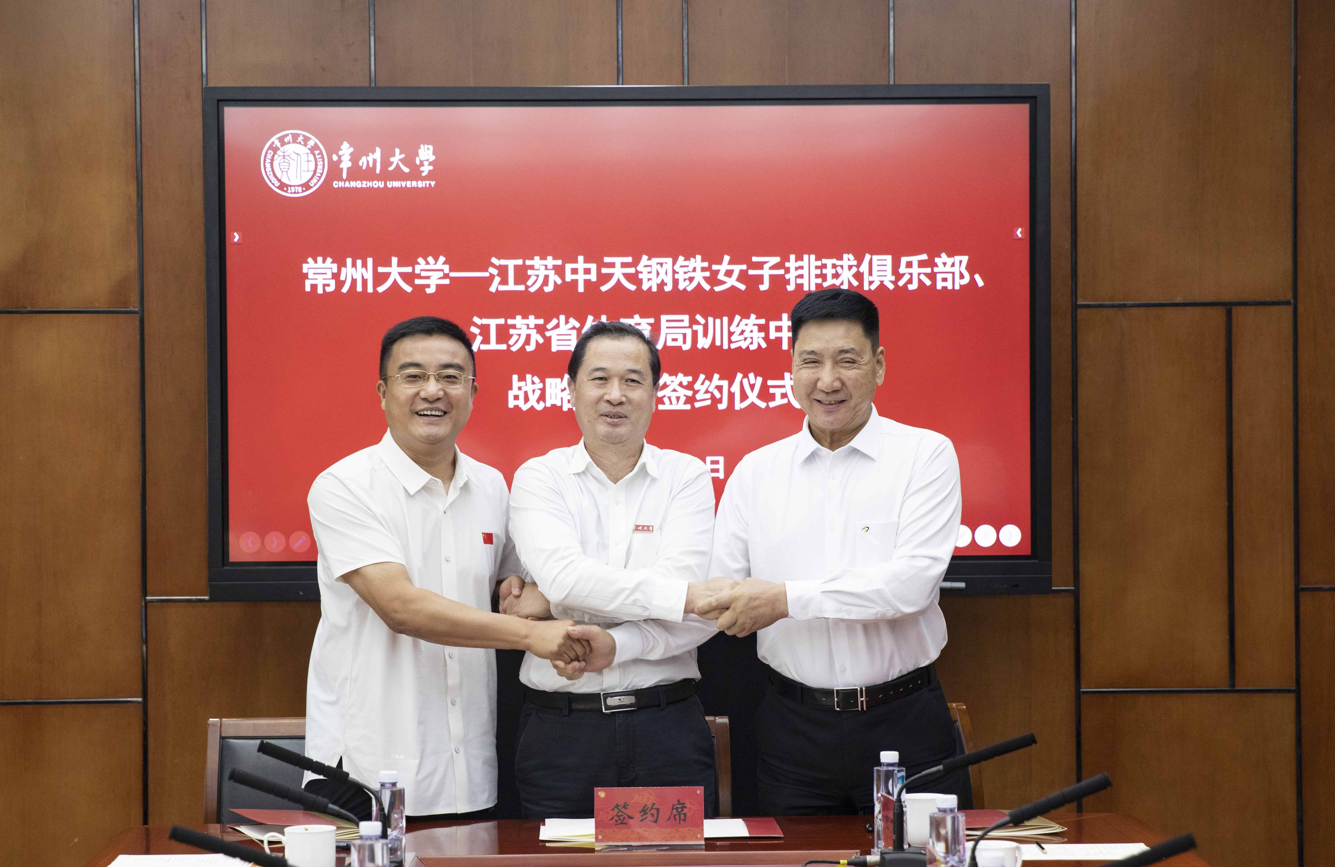 5月31日,常州大学与江苏中天钢铁女子排球俱乐部有限公司、江苏省体育局训练中心战略合作签约仪式在科教城校区文正楼第二会议室举行。江苏省体育局训练中心主任马兆森、排球运动管理中心主任毛武扬,江苏中天钢铁女子排球俱乐部有限公司董事长高一平,常州大学党委书记陈群,党委常委、副校长陆锦冲,党委常委、副校长徐树法出席活动,江苏中天钢铁女子排球俱乐部相关领导、领队、教练员、运动员代表,常州大学党办校办、发展规划处、后服中心、体育学院等相关单位负责人参加活动。陆锦冲主持签约仪式。