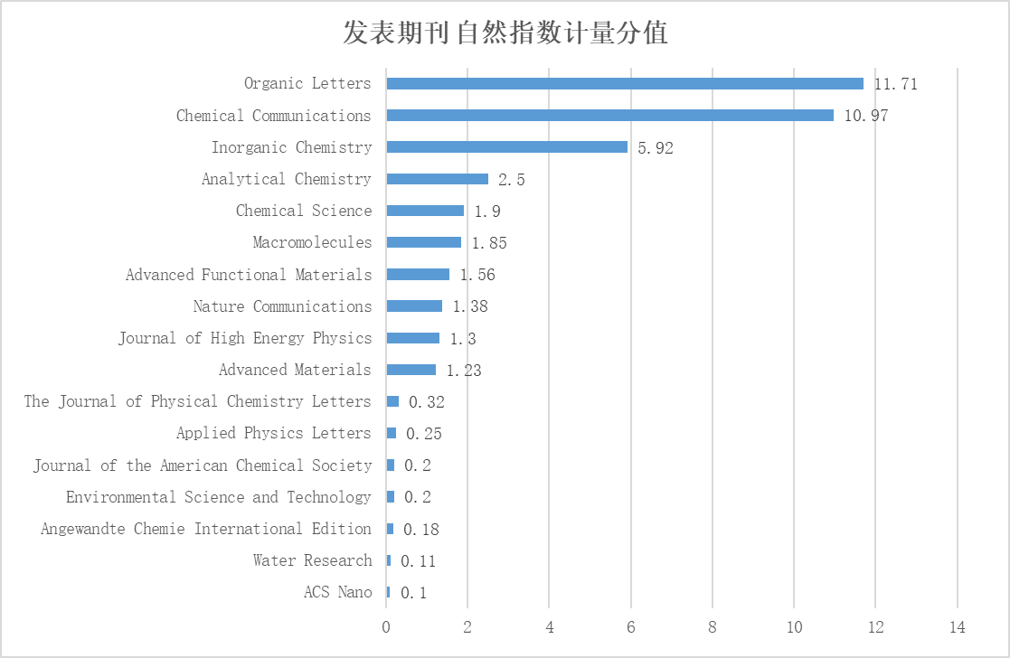 我校教师发表的高水平论文共涉及17种自然指数期刊,其中贡献度排名前5位的期刊分别是Organic Letters(分值为11.71,占比28.12%)、Chemical Communications(分值为10.97,占比26.34%)、Inorganic Chemistry(分值为5.92,占比14.22%)、Analytical Chemistry(分值为2.5,占比6%)、Chemical Science(分值为1.9,占比4.56%)。