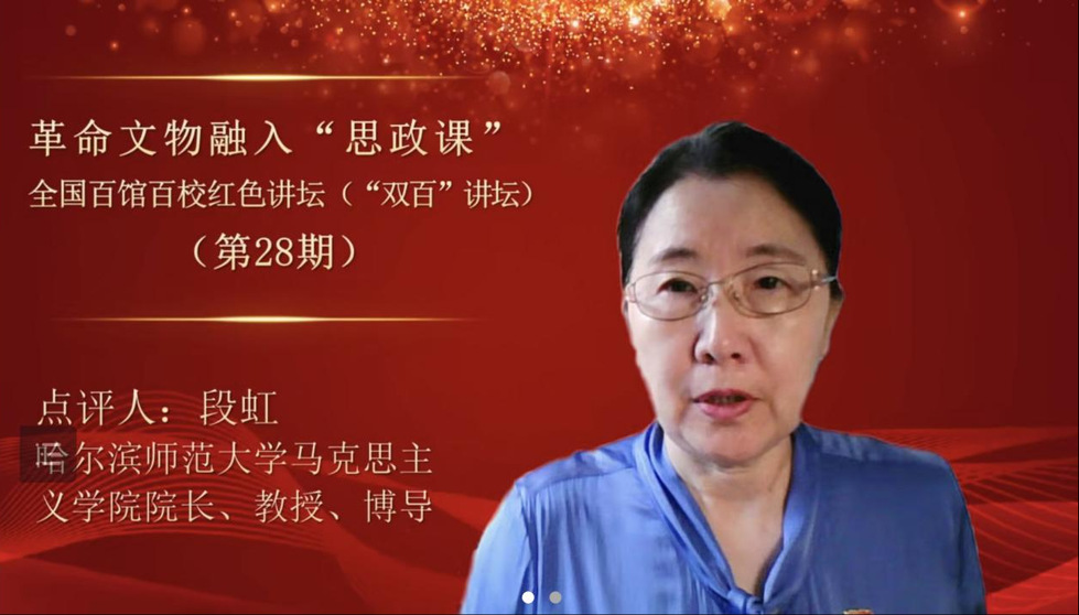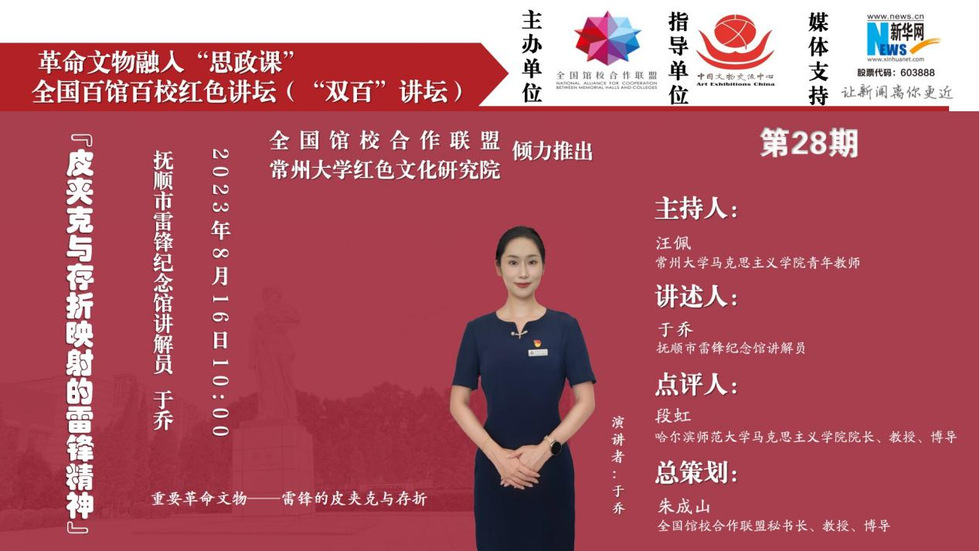 8月16日,为推动用好用活革命文物工作,由全国馆校合作联盟主办,中国文物交流中心指导,常州大学马克思主义学院、常州大学红色文化研究院联袂推出“革命文物融入‘思政课’全国百馆百校红色讲坛”(简称“‘双百’讲坛”)第28期网络课程活动。本期邀请抚顺市雷锋纪念馆讲解员于乔担任讲述人,哈尔滨师范大学马克思主义学院院长段虹教授担任点评人。来自全国馆校合作联盟理事单位的常州大学、哈尔滨师范大学、抚顺市雷锋纪念馆等高校部分师生及博物馆人,通过线上的方式参加了此次活动。