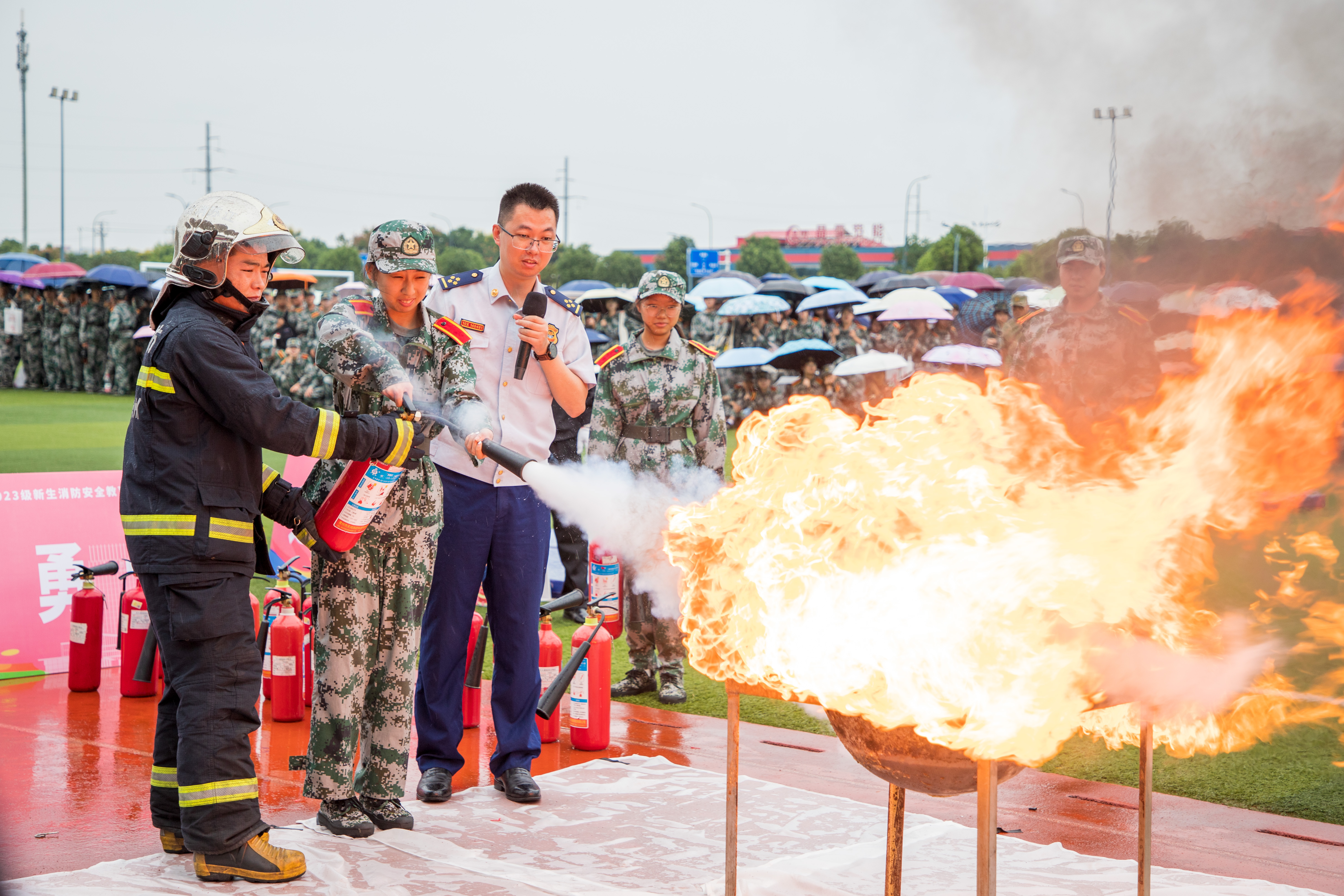 虽然消防安全教育现场秋雨绵绵,但同学们兴致盎然。常州市消防支队宣教科科长周祥为同学们讲解了消防安全知识及应急技能,通过真实案例提醒同学们消防安全涉及生活的方方面面,需要时刻关注。消防员向师生们介绍了常用消防器材的使用方法和功能,并邀请同学代表和教官代表共同体验油盆灭火,掌握灭火器的使用方法。