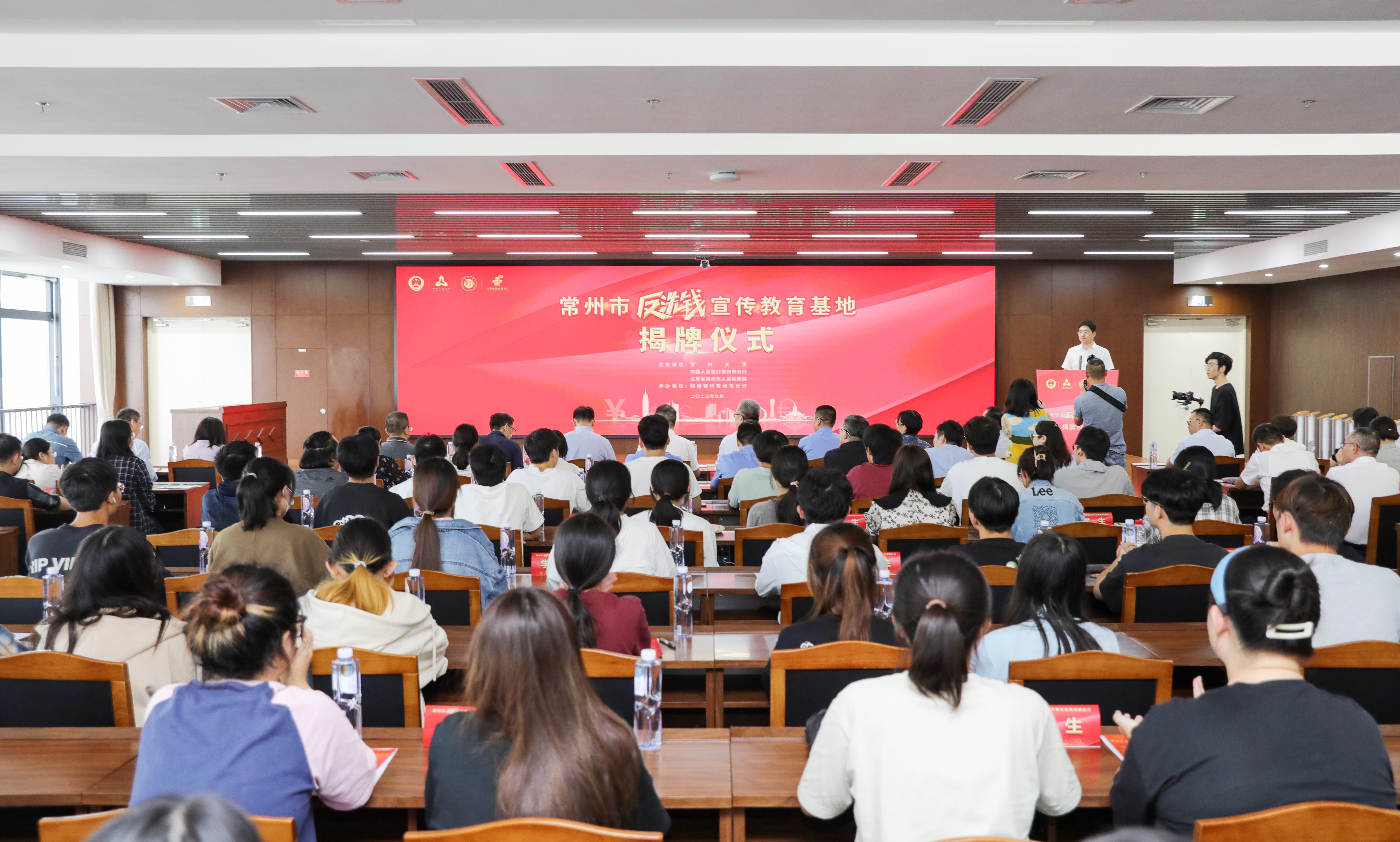 9月25日下午,常州市反洗钱宣传教育基地揭牌仪式在常州大学西太湖校区图文信息中心报告厅举行。中国人民银行常州市分行行长许永伟、副行长任庆,常州市人民检察院副检察长王强、邮政储蓄银行常州市分行副行长张社建应邀出席。常州大学副校长周刚,以及保卫处、吴敬琏经济学院负责人出席活动。相关银行、证券、保险机构负责人代表及吴敬琏经济学院教师和中外学生代表200余人参加活动。