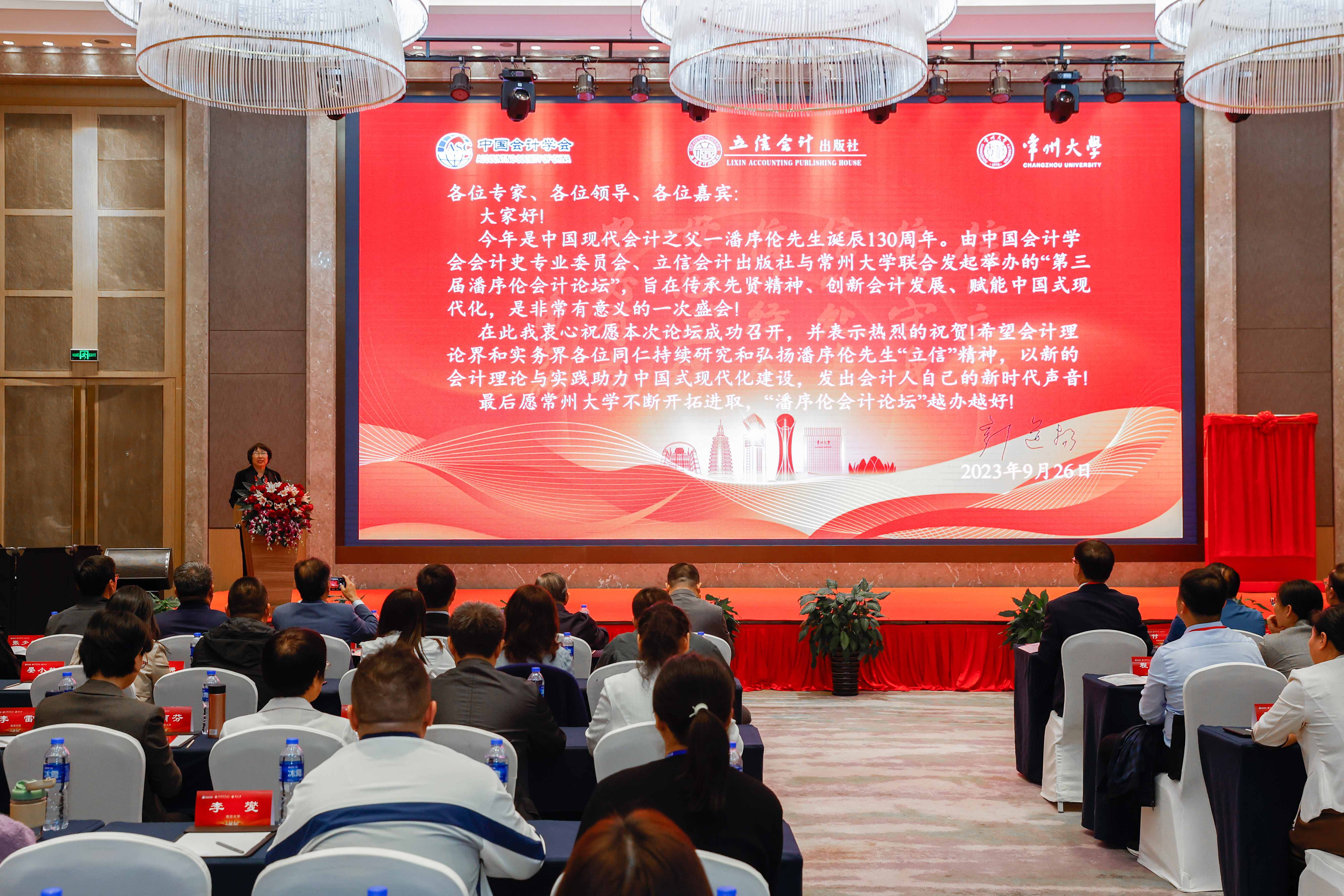 为纪念中国现代会计之父潘序伦先生诞辰130周年,10月21日,第三届潘序伦会计论坛暨中国式现代化下会计思想传承与创新发展学术研讨会在常州大学举办。党委常委、副校长李忠玉,上海立信会计金融学院党委副书记文选才,中国会计学会会计史专业委员会主任付磊,常州大学原副校长王卫星出席论坛。立信会计出版社社长华春荣,《财会通讯》杂志社社长、主编张少堂,《会计之友》杂志社社长、总编笑雪,以及来自全国高校的知名专家学者等200余人参加论坛。