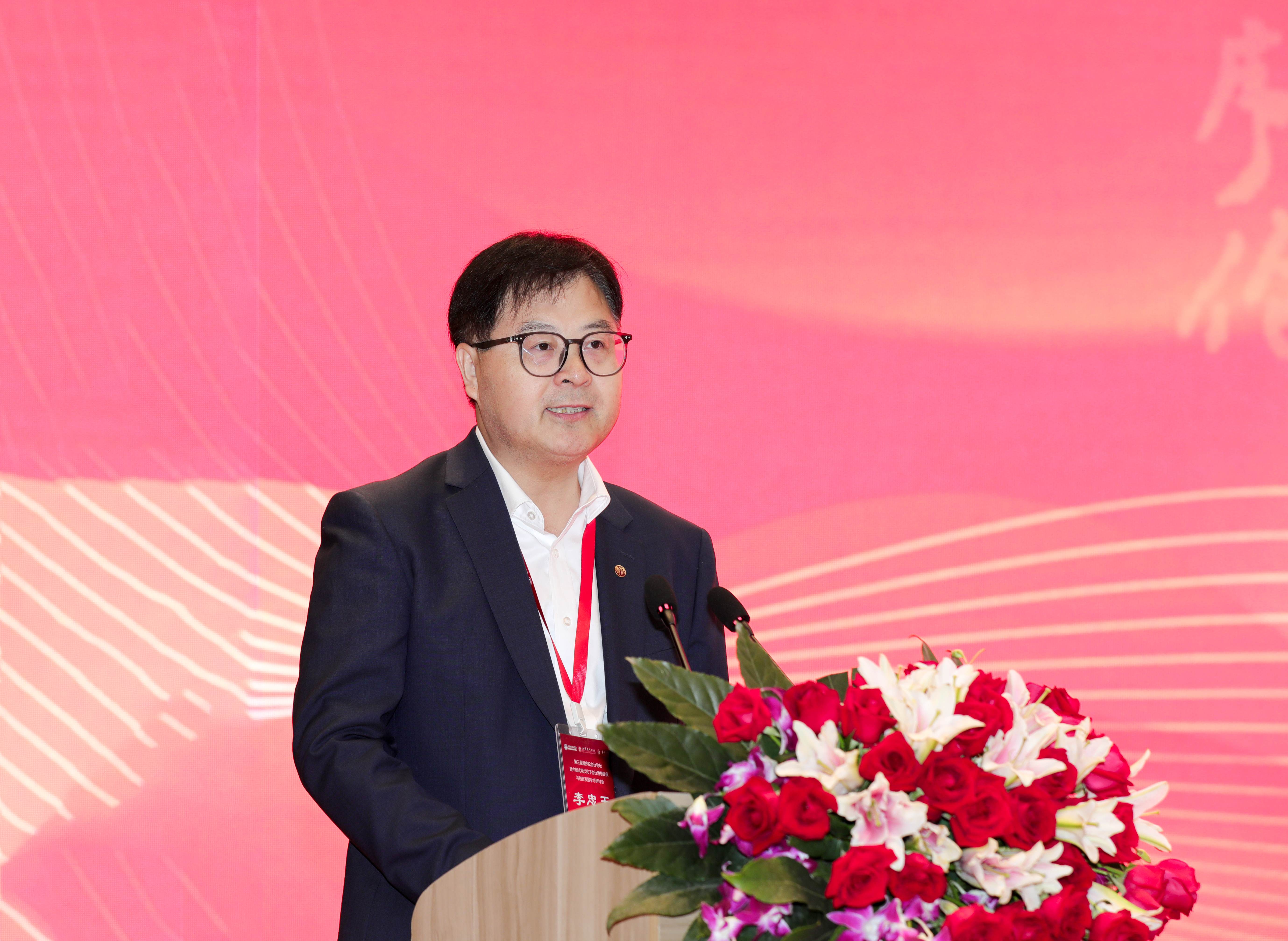 李忠玉在致辞中表示,常州大学注重挖掘名士资源、发挥名人优势,在潘序伦先生诞辰130周年之际举办本次论坛,旨在传承“立信”精神,助推会计学科专业发展,提升人才发展质量。本次论坛是会计理论研究与实务创新的生动实践,也是搭建“校政企”三方合作的学术平台,希望能够为中国式现代化发展积累经验、贡献力量。