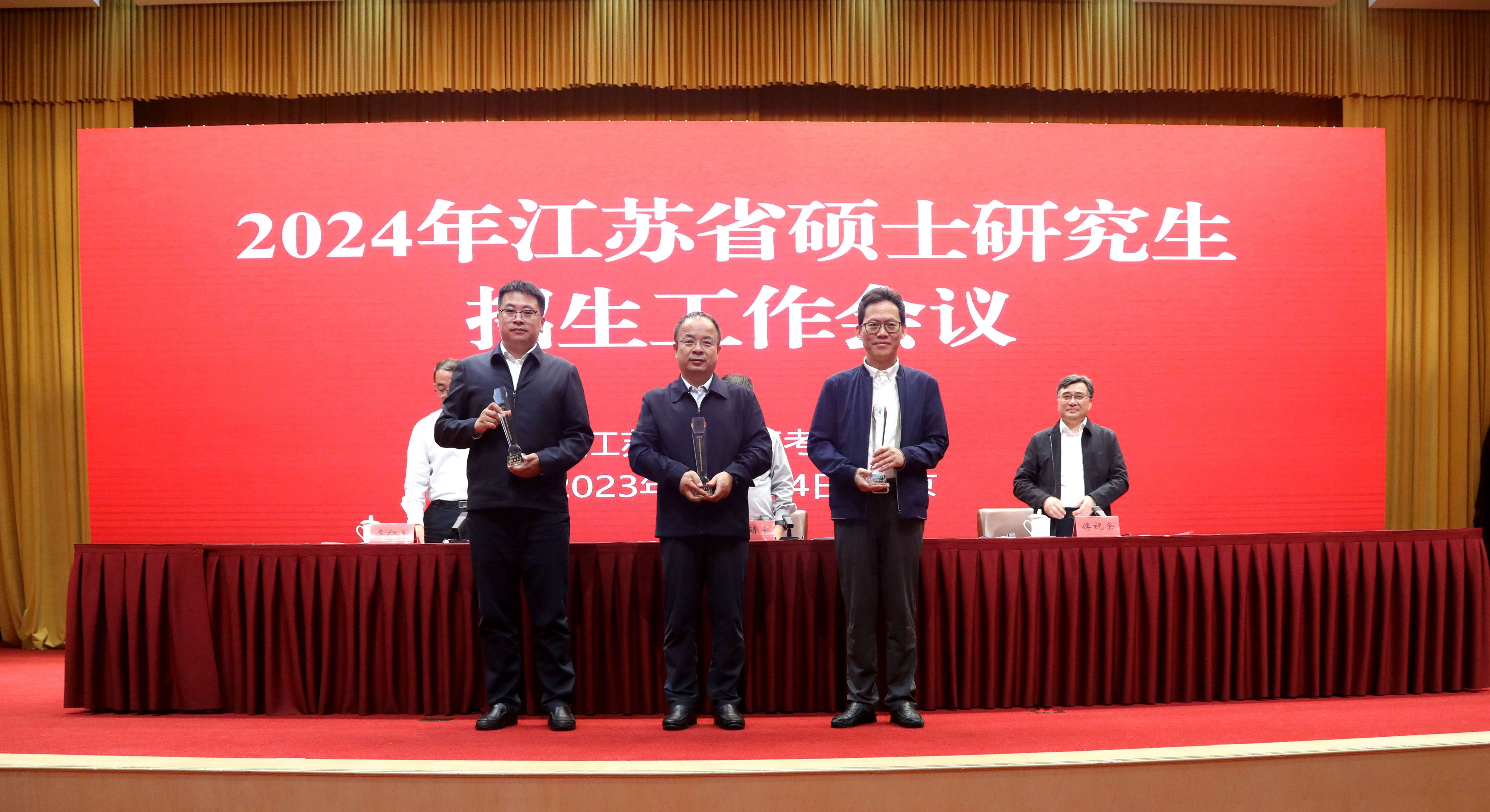 近日,我省召开2024年硕士研究生招生工作会议,全面部署2024年硕士研究生招生考试工作,并对2023年研究生招生工作进行总结表彰。会议表彰了2023年硕士研究生招生考试目标管理考核优秀单位。我校再次获评江苏省研究生招生管理工作“优秀招生单位”和“优秀报考点”,并首次获得高校报考点第三名,党委常委、副校长李亚飞上台领奖。