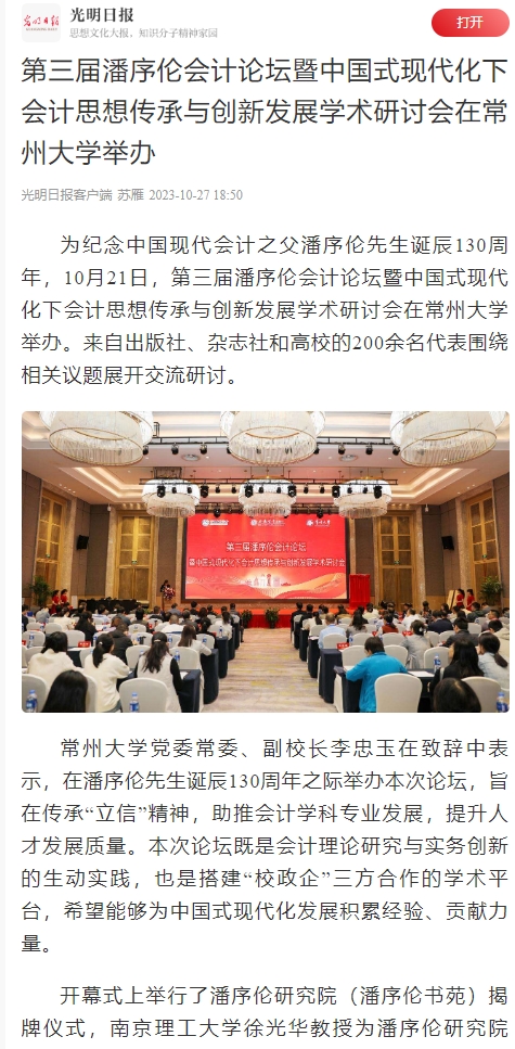 为纪念中国现代会计之父潘序伦先生诞辰130周年,10月21日,第三届潘序伦会计论坛暨中国式现代化下会计思想传承与创新发展学术研讨会在常州大学举办。来自出版社、杂志社和高校的200余名代表围绕相关议题展开交流研讨。