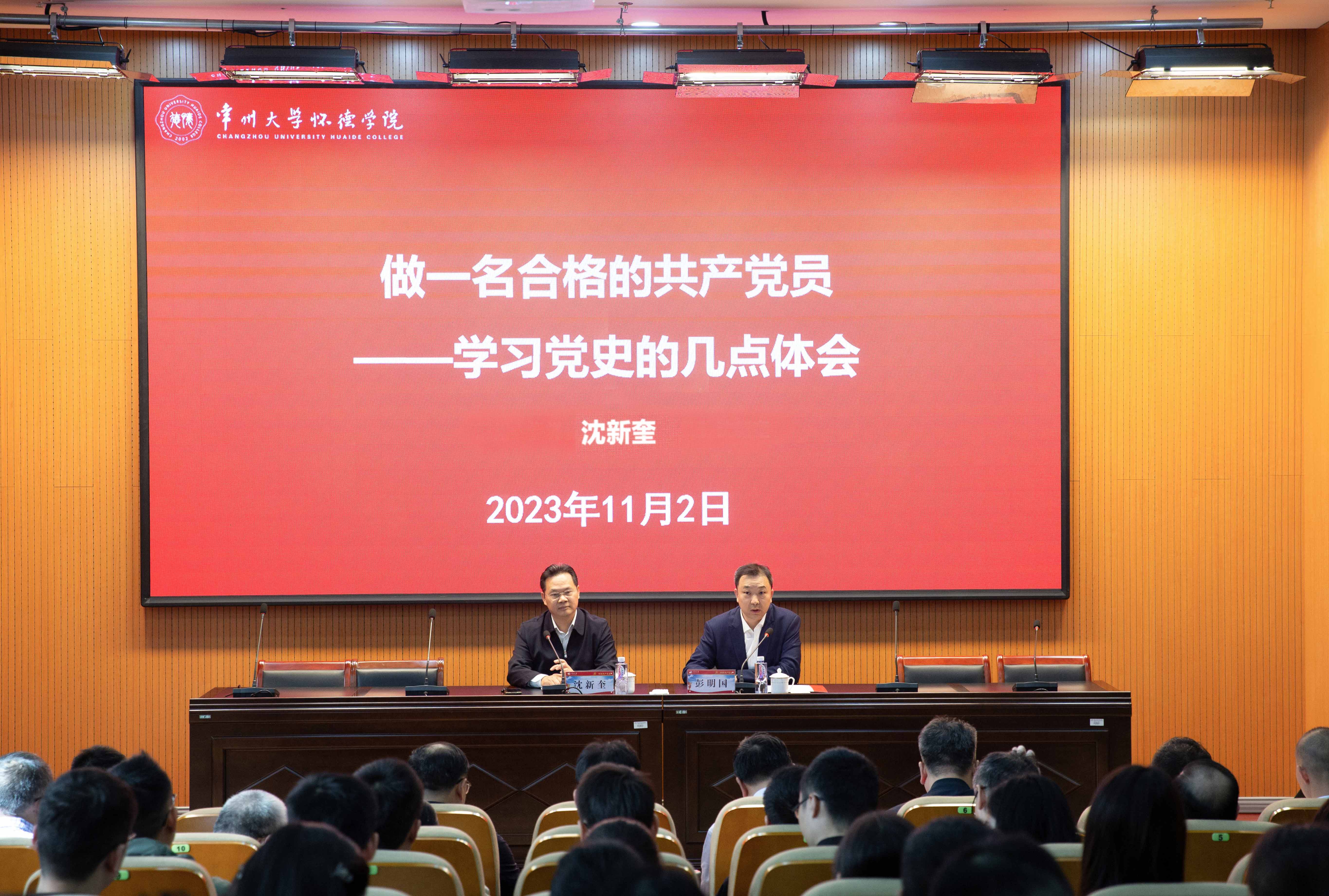 11月2日,常州大学党委常委、纪委书记、省监委派驻监察专员沈新奎到怀德学院作专题党课报告。怀德学院全体院领导、中层干部、辅导员和相关职能部门人员聆听报告。党委常委、副校长彭明国主持报告会。