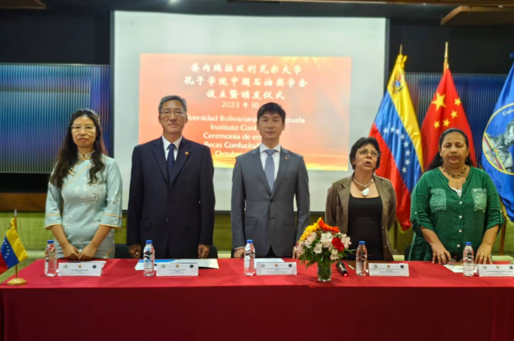 10月28日下午,我校玻利瓦尔大学孔子学院举行了中国石油奖学金设立暨颁奖仪式。中国驻委内瑞拉大使蓝虎、委内瑞拉高等教育部长兼玻利瓦尔大学校长奥布里塔斯和中国石油拉美公司总经理黄革应邀出席。孔子学院中外方院长和师生代表参加仪式。孔子学院学员Salomé Martínez主持活动。