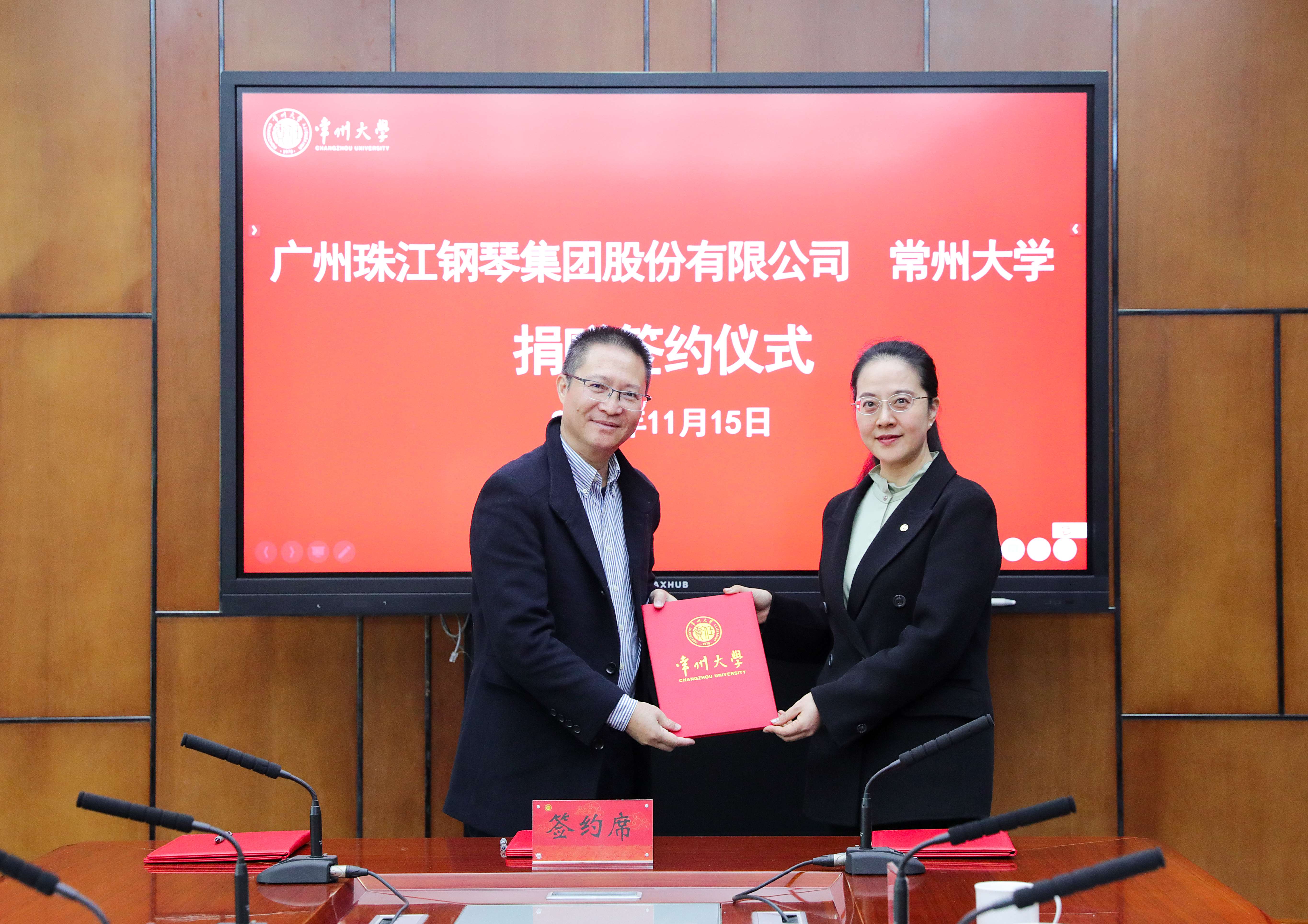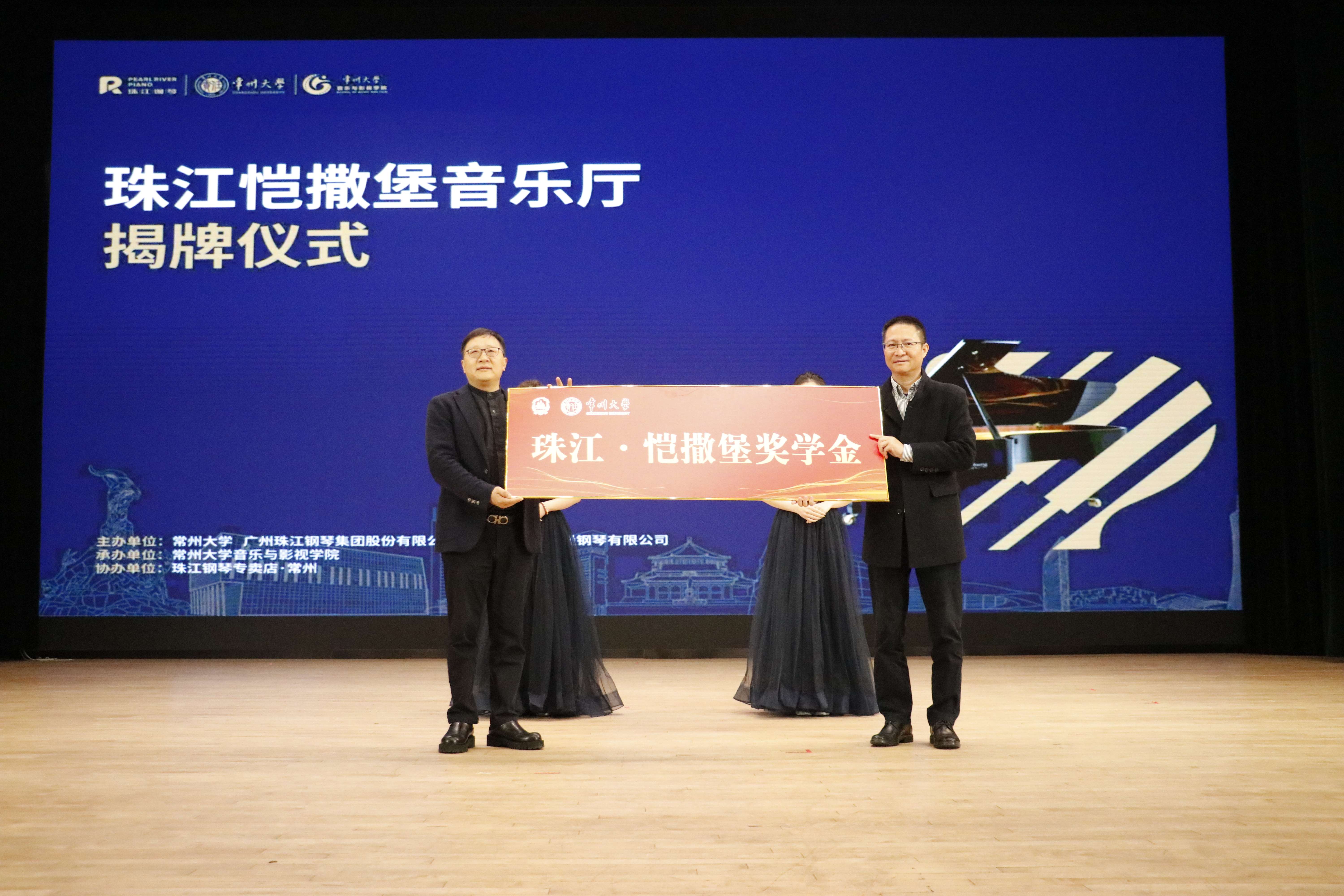 11月15日,学校举行珠江钢琴集团股份有限公司捐赠签约仪式和珠江恺撒堡音乐厅揭牌仪式。广州珠江钢琴集团股份有限公司党委书记、董事长李建宁,常州大学党委常委、副校长杨琳出席活动,校教育发展基金会秘书处、西太湖校区管委会、音乐与影视学院相关负责人陪同参加活动。