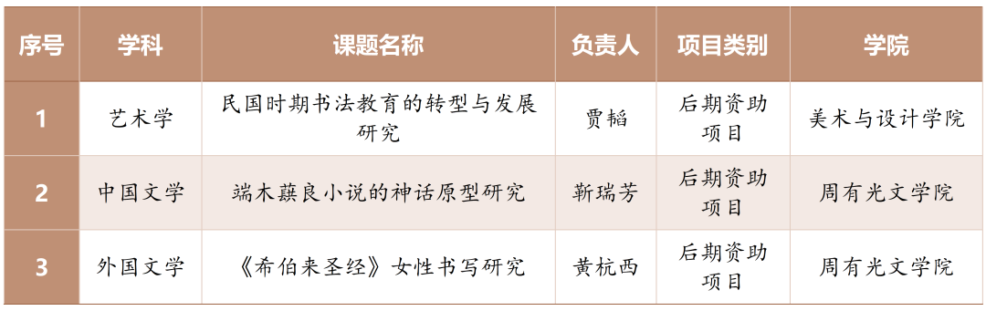 此次获批的3个项目均为以博士论文为基础申请的国家社科基金后期资助一般项目。从学科分布来看,涉及中国文学、外国文学和艺术学3个学科。从学院分布来看,周有光文学院获批2项,美术与设计学院获批1项。