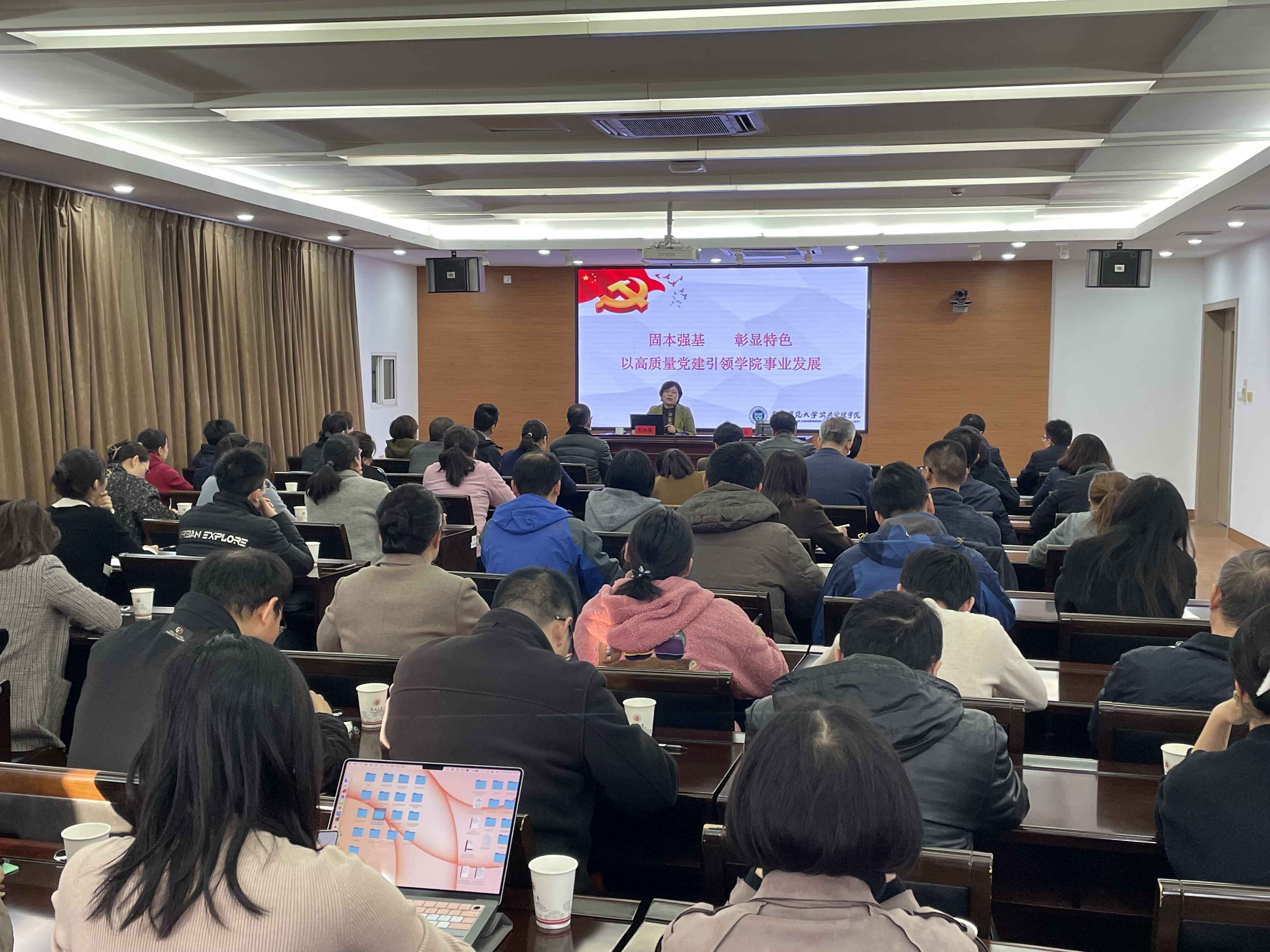 11月16日下午,我校开展学习贯彻校第三次党代会精神党务工作者专题培训,南京师范大学公共管理学院党委书记朱冬梅应邀来校作题为“固本强基 彰显特色 以高质量党建引领学院事业发展”专题报告,各二级党组织书记、专职组织员,教师党支部书记代表近80人聆听报告。报告会由党委常委、组织部部长秦义主持。