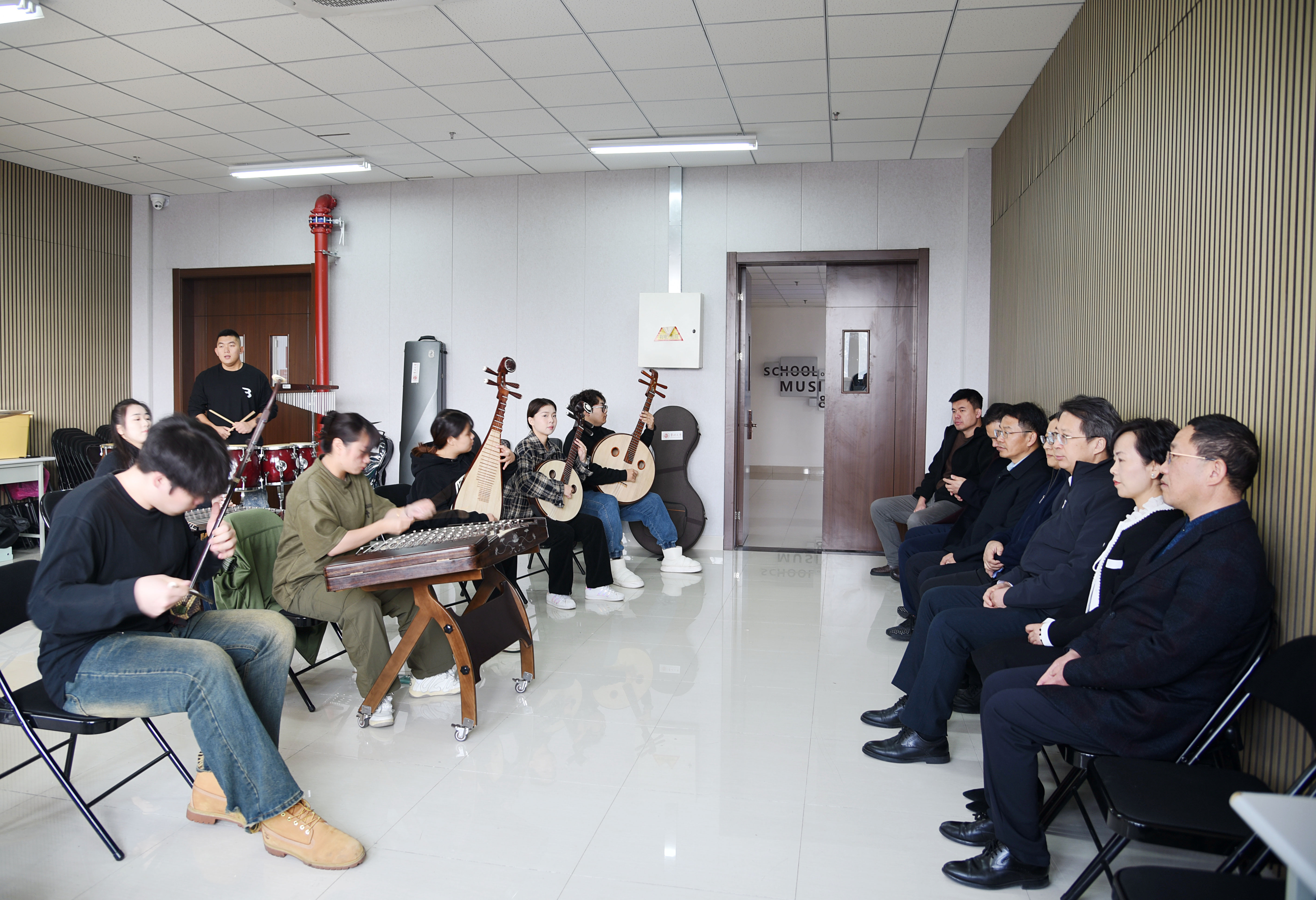 调研期间,徐守坤一行走访了学生琴房和舞蹈房,观看了龙韵民乐团演奏的大艺展参赛作品《奔流》,参观并指导了学院思政“墙文化”建设。(通讯员/李思琦 审核/唐琳 编辑/庄媛)