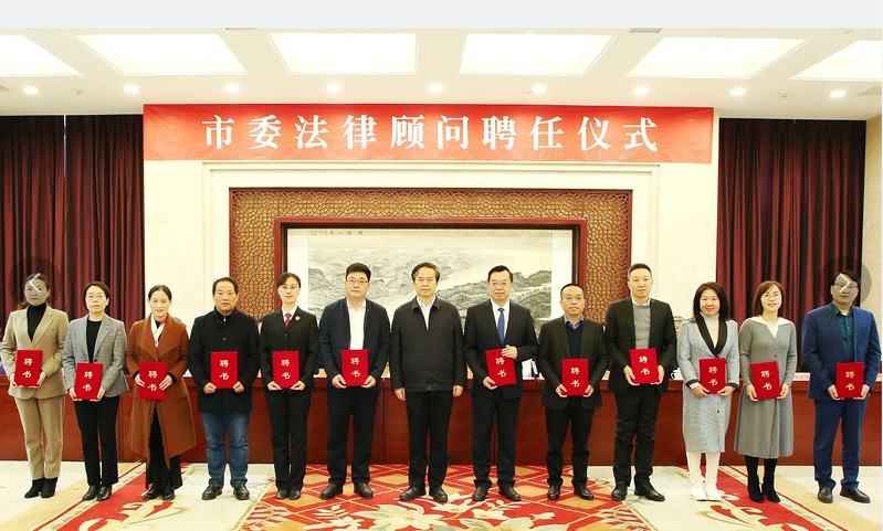 杭勇向专家、律师颁发第二届市委法律顾问聘书。他希望大家各展所长献计策,共同协力助法治,充分发挥市委智囊团作用,助推市委“532发展战略”和新能源之都建设。