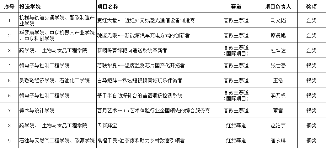 12月3日至6日,中国国际大学生创新大赛(2023)在天津大学举行。我校学子经过层层角逐,获国赛金奖3项,银奖4项,铜奖2项。其中高教主赛道金奖2项,银奖3项,铜奖2项;高教主赛道国际项目金奖1项,银奖1项,首次获得高教主赛道本科生创意组金奖、国际项目金奖,金奖总数、获奖总数再创新高!