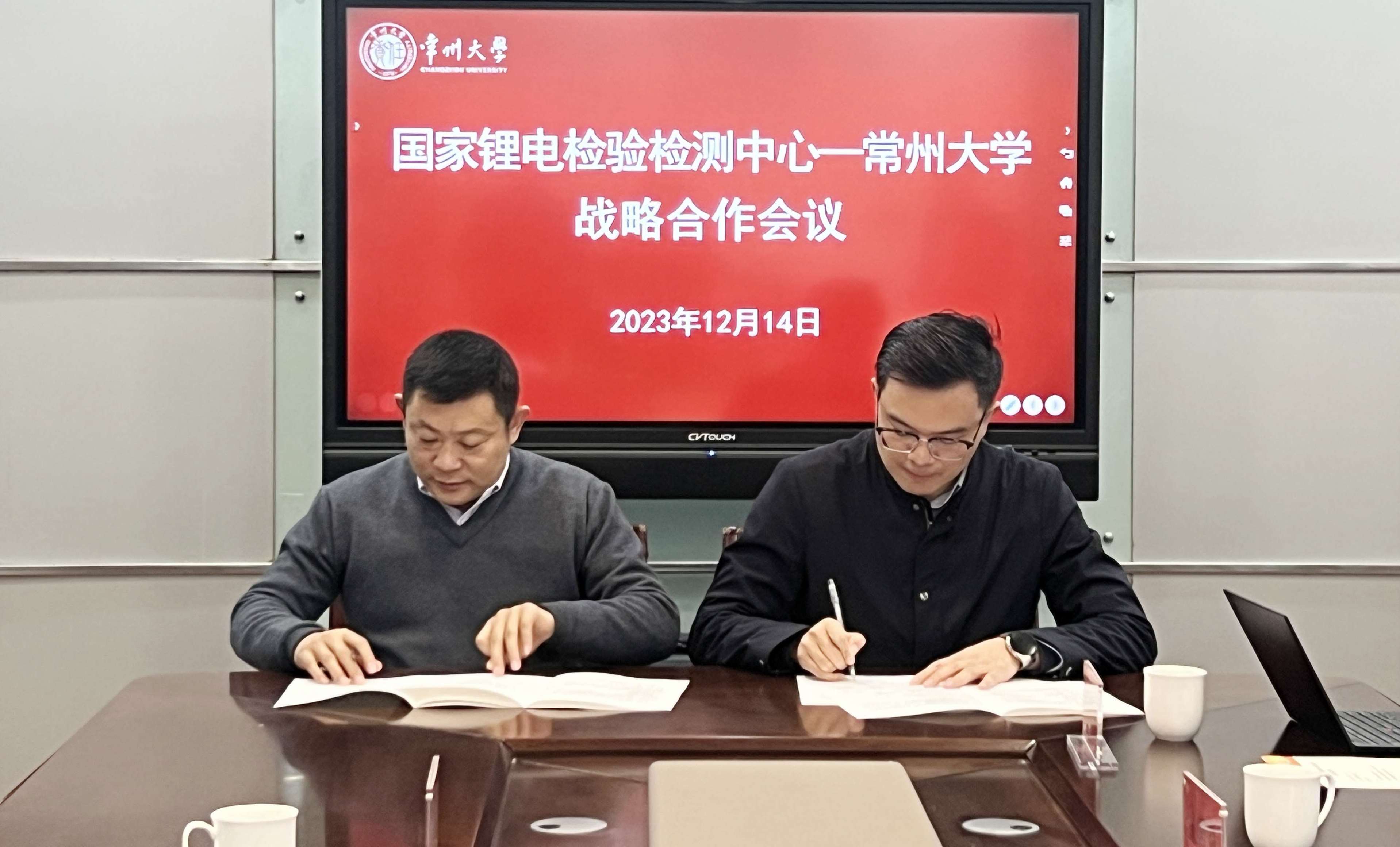 12月14日,国家锂电池产品检验检测中心与常州大学在科教城校区文正楼第三会议室举行合作协议签约仪式。常州大学副校长晏成林、国家锂电池产品检验检测中心主任周翔升、常州市新能源集团总经理刘龙才、常州市建筑科学研究院集团股份有限公司战略发展部总经理武新民,以及学校产学研合作处、资产经营公司等相关负责人出席签约仪式。