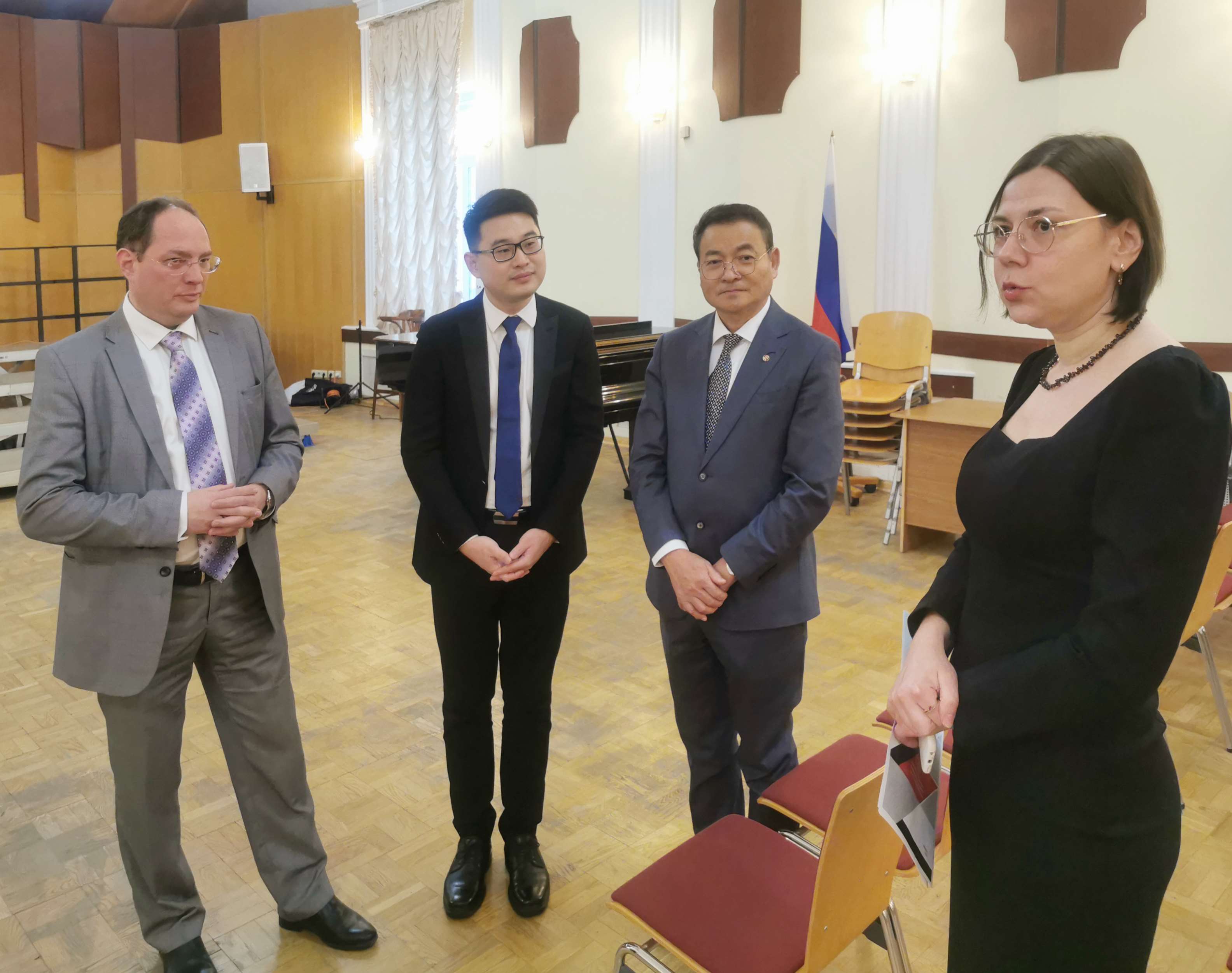 访问莫斯科国立柴可夫斯基音乐学院期间,我校代表团与校长亚历山大·索科洛夫,学校教育教学高级顾问、原第一副校长拉丽莎·斯卢茨卡娅,分管国际事务副校长玛格丽特·库拉德金娜进行会见,签订了两校联合博士人才培养、共建高水平国际音乐节、大师班、高水平艺术实践、共建科研团队等全面合作协议。会后,代表团参观了学校著名的法因贝格和涅高兹钢琴教室、大小音乐厅及著名音乐家雕像陈列室。