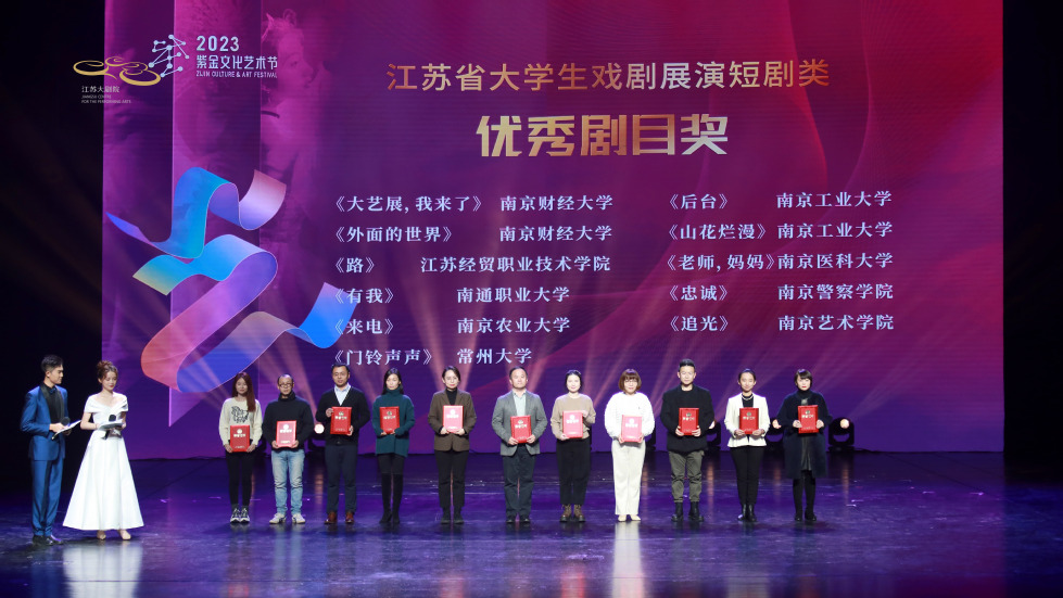 12月18日,2023江苏省大学生戏剧展演颁奖仪式在江苏大剧院举行。我校原创诗话剧《月亮与烟火》获长剧类一等奖,小品《门铃声声》获短剧类优秀剧目奖,常州大学荣获优秀组织奖,童劲杰、陈思含获优秀指导教师奖。江苏省委宣传部副部长徐宁、省教育厅二级巡视员李金泉、省文联一级巡视员刘旭东等领导出席活动并为获奖单位及个人颁奖。我校党委常委、副校长杨琳出席活动,音乐与影视学院相关人员陪同参加。