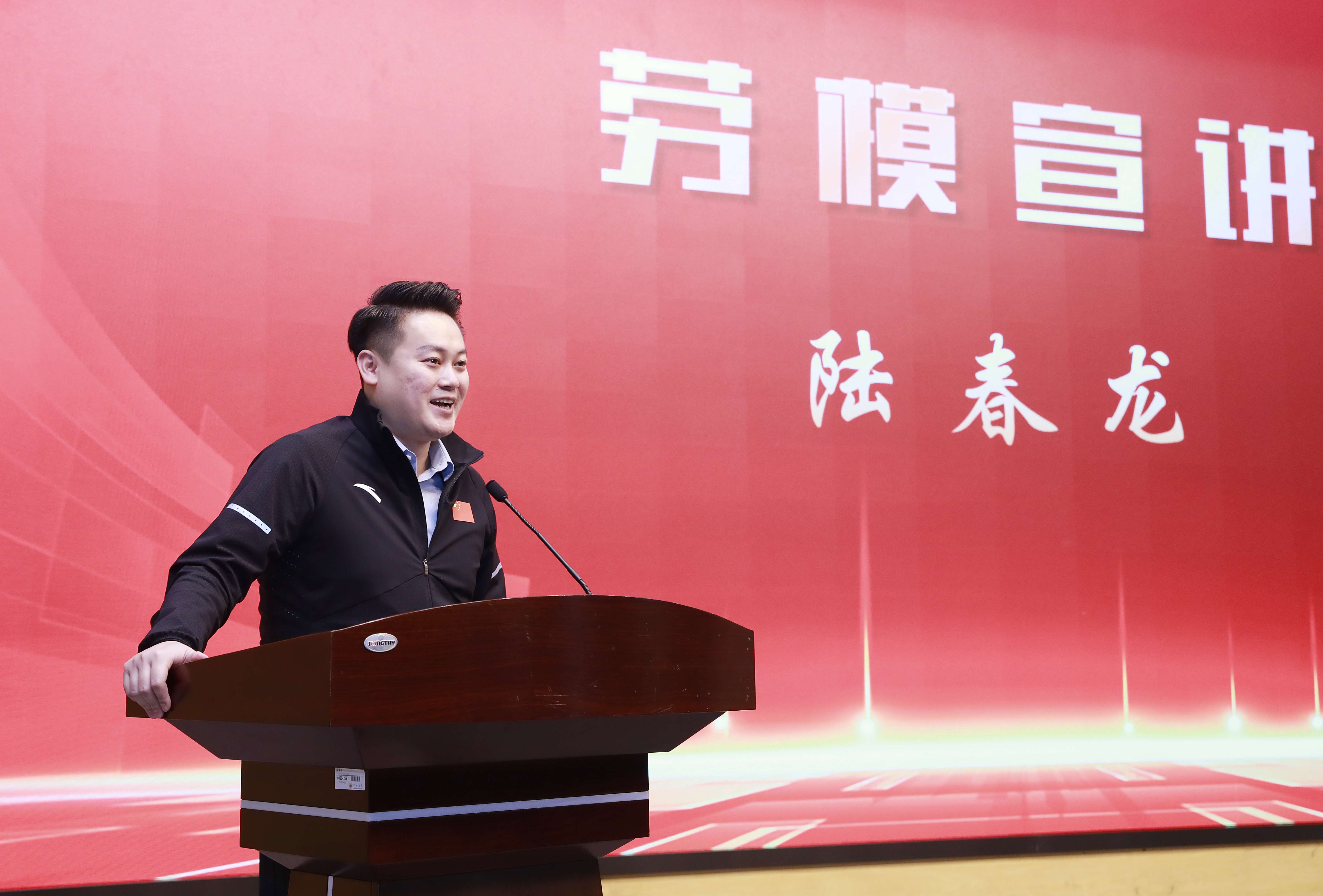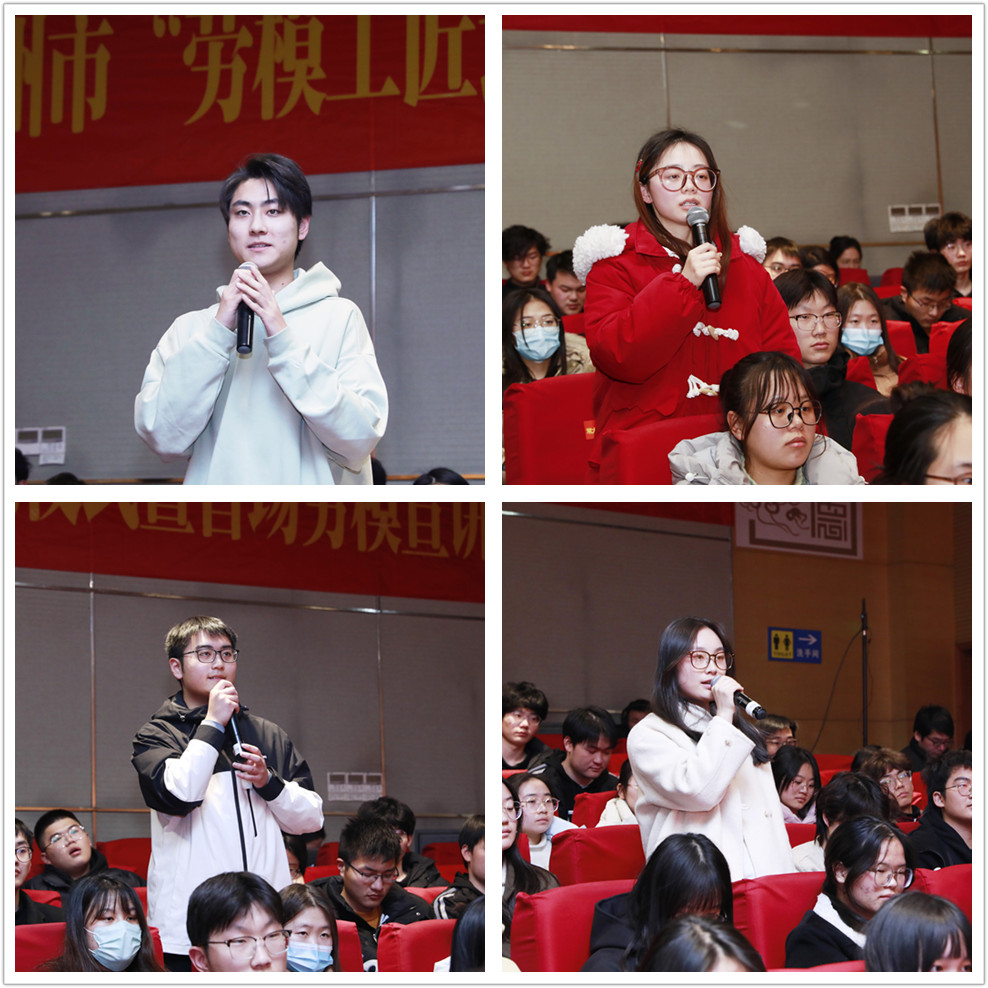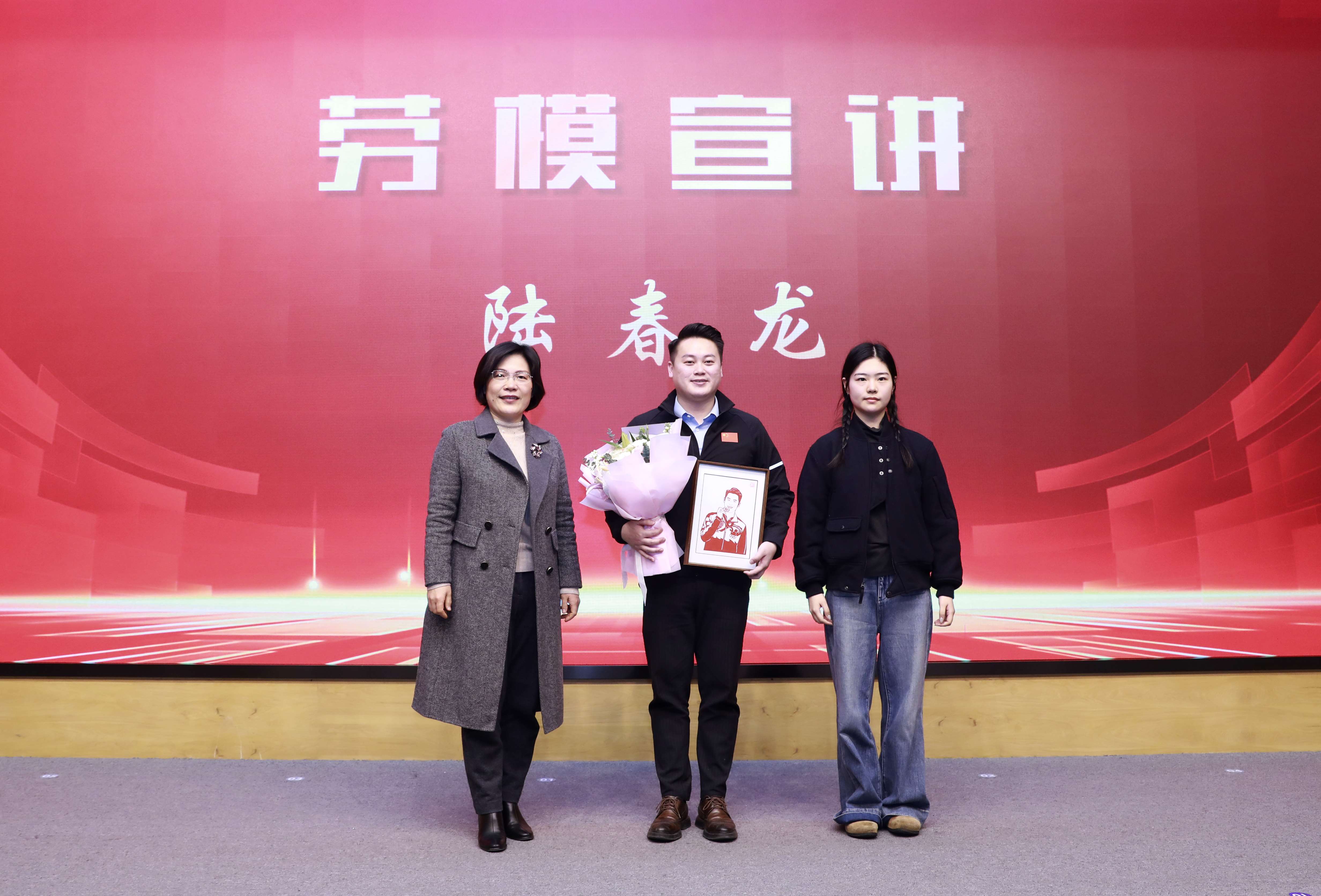 江苏省劳动模范,2008年北京奥运会蹦床冠军,全国五一劳动奖章获得者,南京体育学院团委书记、创新创业学院院长陆春龙,以“个人天赋、持续思考、追逐梦想、抗压能力、锤炼心态、感恩伯乐”等方面为立足点,用“经得起折磨、经得起寂寞、经得起批评、经得起表扬”四个关键词,与大家分享他的奋斗经历。他自强不息、永不言弃、持续奋斗、坚持学习的拼搏精神和富有感染力的话语,使现场师生深受感染、倍受鼓舞。全国劳动模范、全国五一劳动奖章获得者,黑牡丹(集团)股份有限公司技术总监邓建军以《争当知识型技能型创新型人才》为题,结合他的工作成长经历、工作体会与个人认识,从适应环境求知识、消化吸收再创新、技术创新求发展等方面生动讲述了当代匠人的故事,诠释了“专、精、创”的工匠精神,勉励同学们明确目标立志向、摒弃浮躁心理,树立终身学习的理念。两位劳模与同学们进行了现场互动,逐一解答了同学们的提问。朴实的语言、真挚的情感,生动诠释了新时代的劳模精神。黄海燕向劳模赠送肖像刻纸,学生代表向劳模献花来表达敬意。