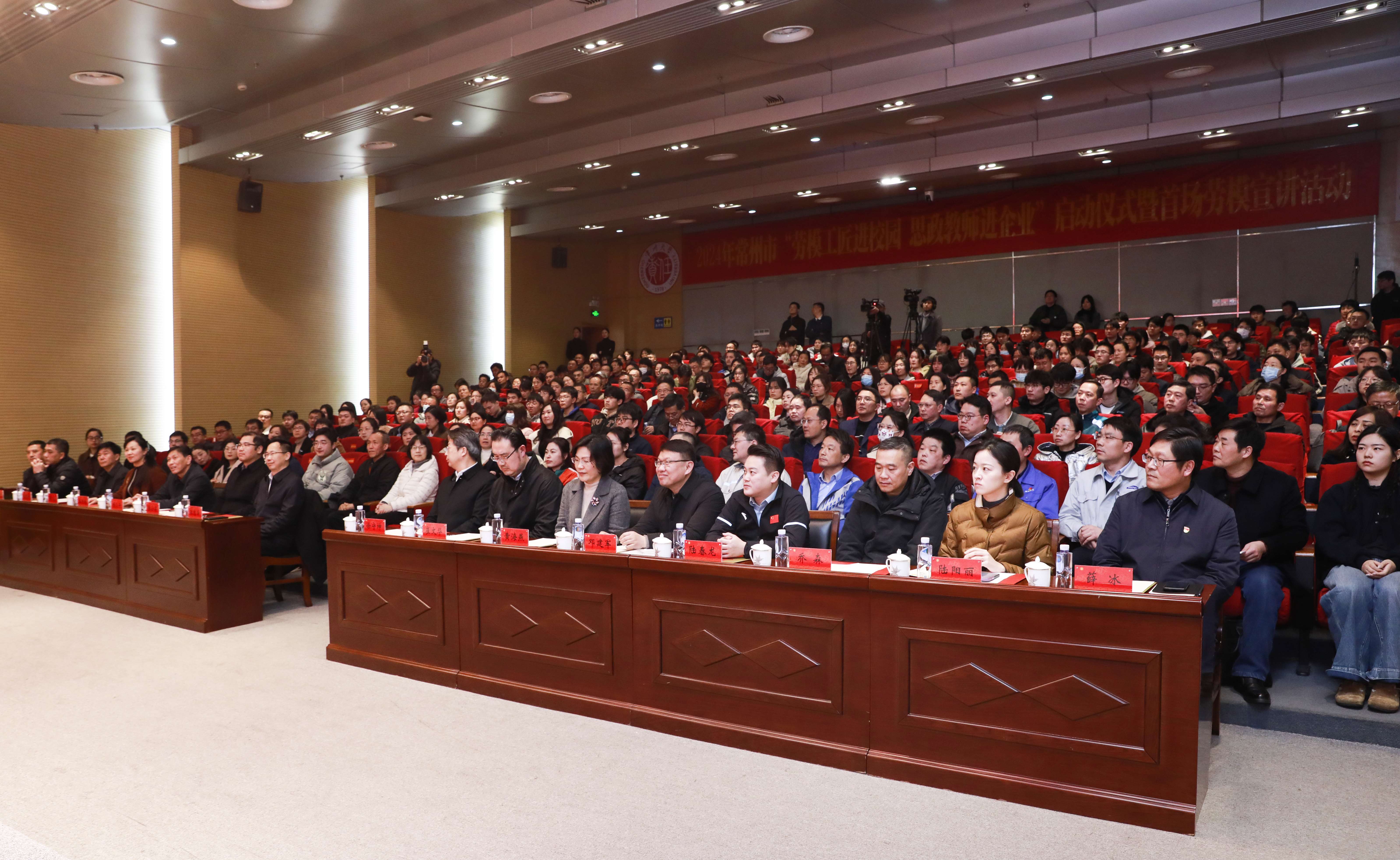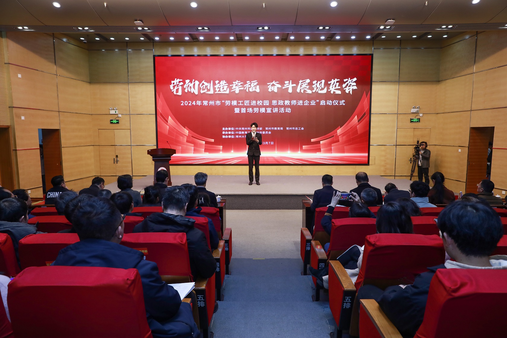 3月7日下午,由中共常州市委宣传部、常州市教育局、常州市总工会主办,常州市教育工会承办的2024年常州市“劳模工匠进校园 思政教师进企业”启动仪式暨首场劳模宣讲活动在我校科教城校区文彰楼报告厅举行,并向全市同步直播。江苏省教育科技工会副主席崔文华,中共常州市委宣传部常务副部长汪忠泽,常州市总工会党组书记、副主席张小军,常州市教育局专职委员徐小平,常州市总工会副主席王丹丹莅临活动现场。我校党委书记徐守坤,党委副书记黄海燕,党委常委、宣传部部长薛冰出席活动。全市劳模工匠代表,思政教师代表,各辖市区宣传部、教育局、工会等部门领导,在常高校、教育局直属学校领导、工会主席,乡镇街道代表及大中小学师生代表近300人参加活动,全市各大中小学、部分企业在分会场通过网络直播参加活动。