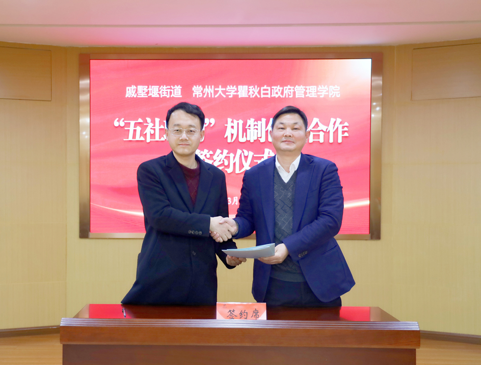 刘晓莲介绍了街道近期社区建设和社会治理工作情况。陈粲介绍了学校和学院的基本情况,希望与戚墅堰街道加强合作,共同探索“五社联动”机制创新研究,共同推进社会治理现代化。姜祖胜表示,希望得到常州大学瞿秋白政府管理学院专家学者的理论指导和智力支持,提升戚墅堰街道“五社联动”机制,推进基层治理体系和治理能力现代化。