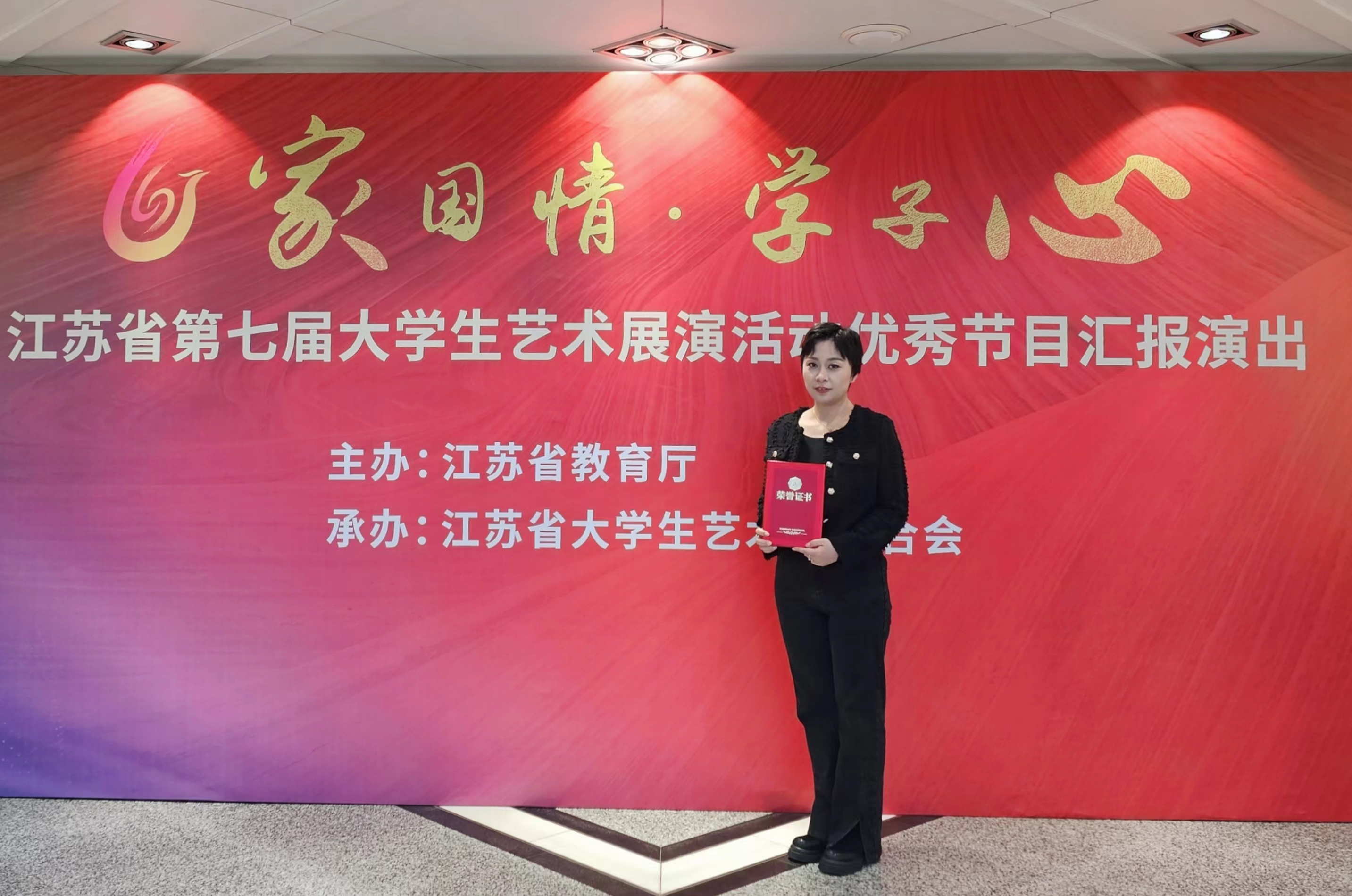 活动现场还为全省51所优秀组织奖高校、20个优秀大学生艺术团、50名优秀美育管理工作者授奖。我校团委艺术教育中心葛酉旖老师获评“江苏省优秀美育教育工作者”荣誉称号并上台领奖。她表示,获评全省优秀美育教育工作者荣誉称号,是对过去工作的肯定,同时更是激励自己在未来更好地立足于提升学生认识美、理解美、欣赏美、创造美的能力,发力于带领学生创作更多具有传播价值的优秀美育作品。