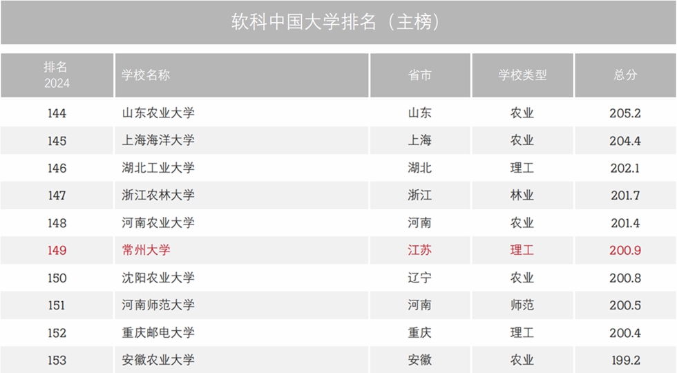 2024年软科中国大学排名(主榜)上榜高校共594所,常州大学综合排名为近三年最佳,位列全国第149名,较上一年度提升3名;全国理工类高校第60名,较上一年度提升1名;江苏省内高校第19名。在办学资源、科学研究、服务社会、高端人才以及国际竞争力等5个单项模块中,常州大学表现较为突出,各单模块排名均高于综合排名名次。