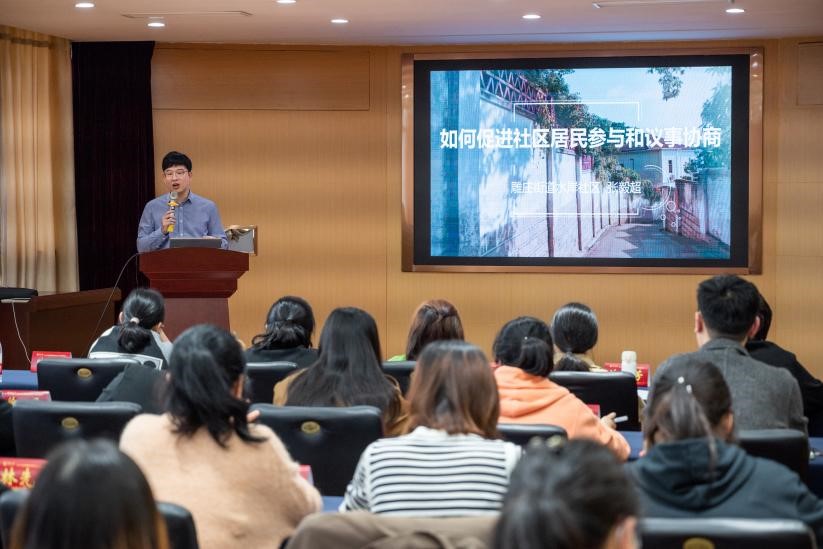 张毅超以“如何促进社区居民参与和议事协商”为主题,结合自身工作经验与体会,指出要从“人从哪里来、事情从哪里来和钱从哪里来”三个维度考虑如何将旁观者转化成行动者,以抓关键少数、以共同目标设计有意义的活动和以效益为核心的方式方法来提高企业单位、居民群众参与度。张毅超用三个动员案例,生动形象地描述如何在社区开展形式多样的活动,来提升群体的认同感与归属感,激发居民参与热情。他通过介绍雕庄模式下的和谐议事,以“流动小板凳工作法”解民忧暖民心,强调了社区需要做到动员社区居民参与治理与调解多方矛盾。