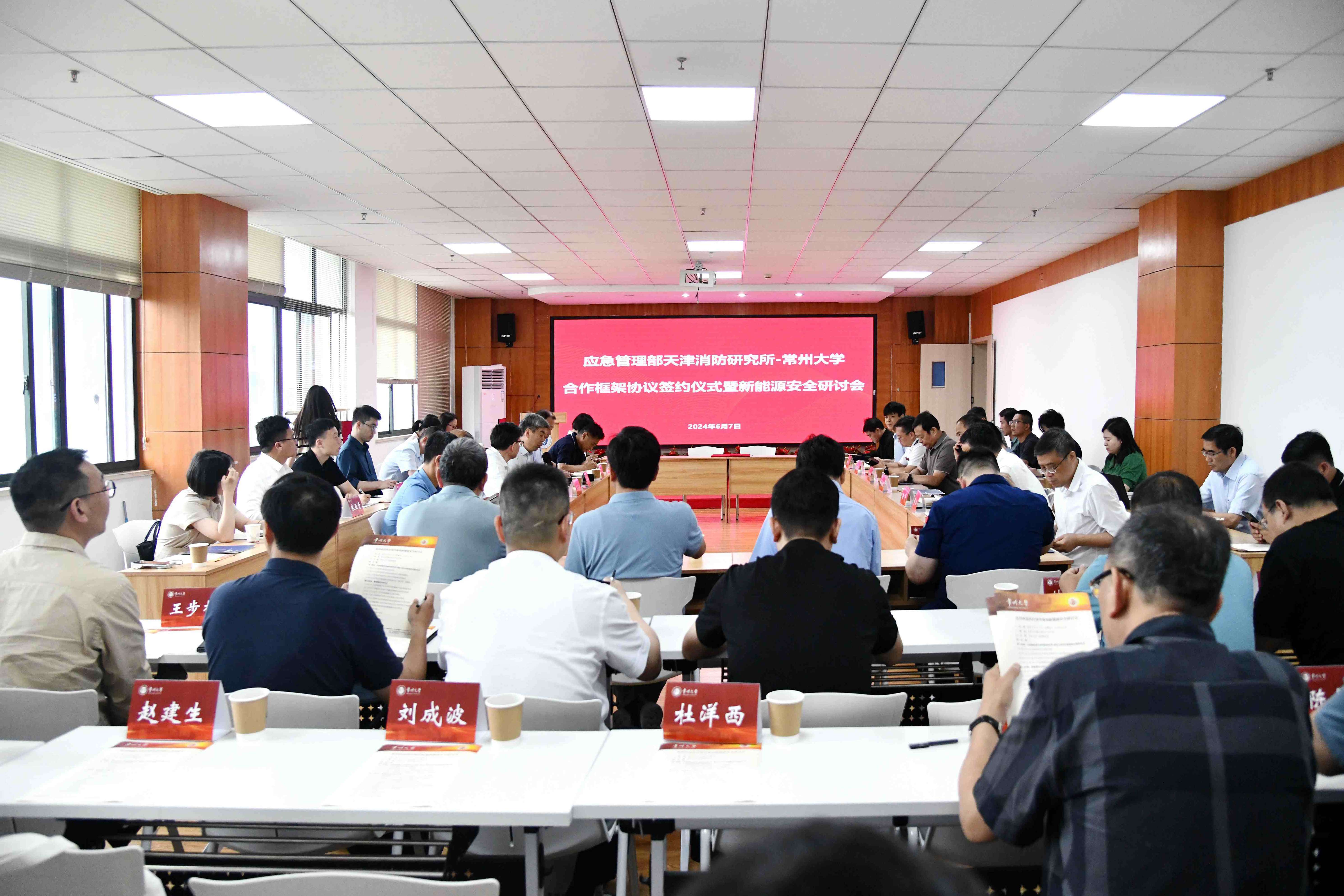 6月7日,由常州大学主办,常州大学安全科学与工程学院承办的应急管理部天津消防研究所-常州大学合作框架协议签约暨新能源安全研讨会在科教城校区逸夫楼516会议室举办。应急管理部天津消防研究所副所长鲁志宝,中关村储能产业技术联盟副秘书长唐亮,中科院物理所、天目湖先进储能技术研究院院长李泓,应急管理部灭火救援专家组专家、北京应急技术创新联盟理事长吴志强,中国安全产业协会应急创新分会秘书长王军,常州市应急管理局党委书记、局长岳军,常州消防救援支队支队长胡庚松,常州大学副校长晏成林,安全科学与工程学院负责人及来自国内新能源安全领域的相关技术专家、高校学者、企业界代表等60余人参加会议。常州大学产学研处处长宋国强主持会议。