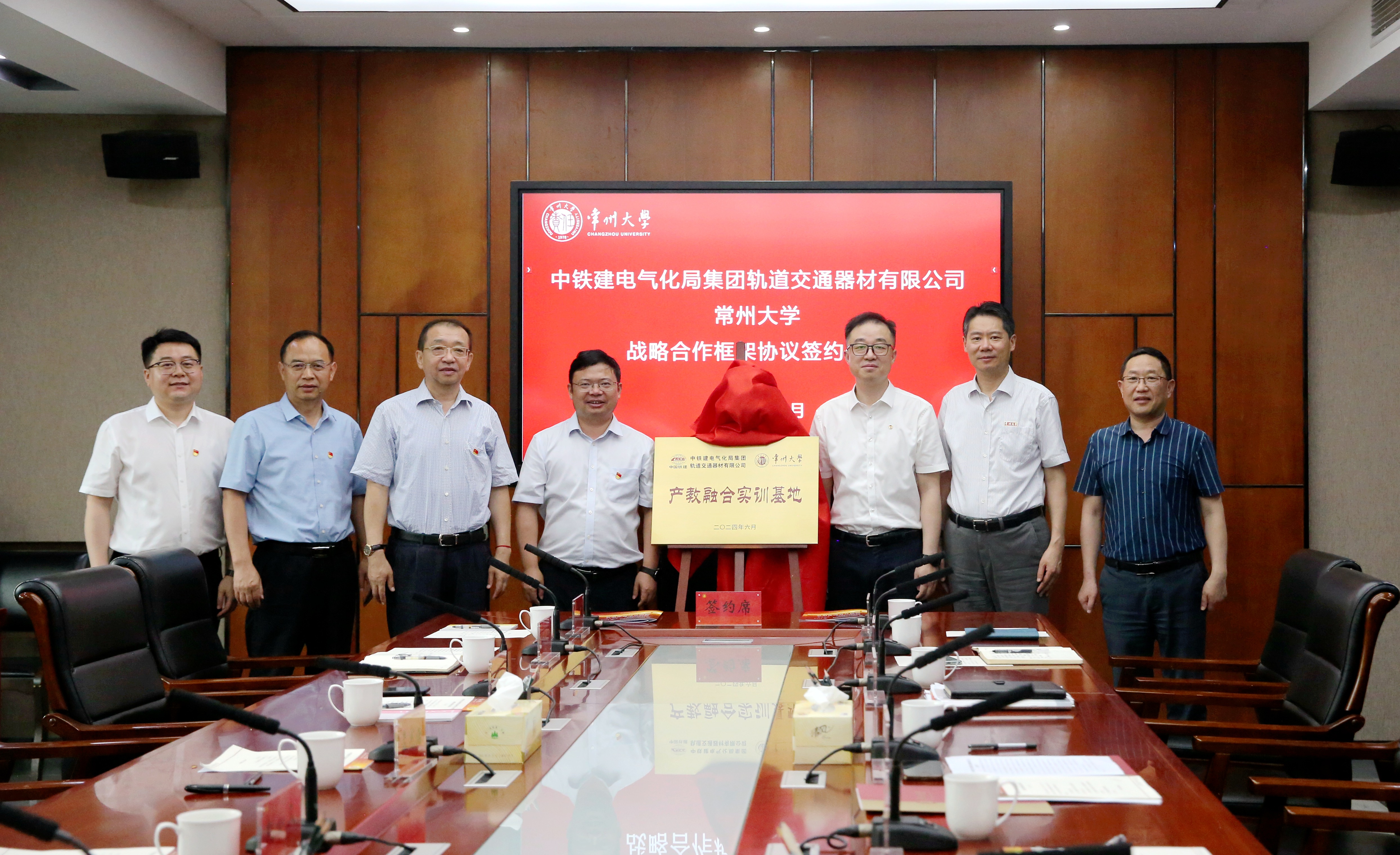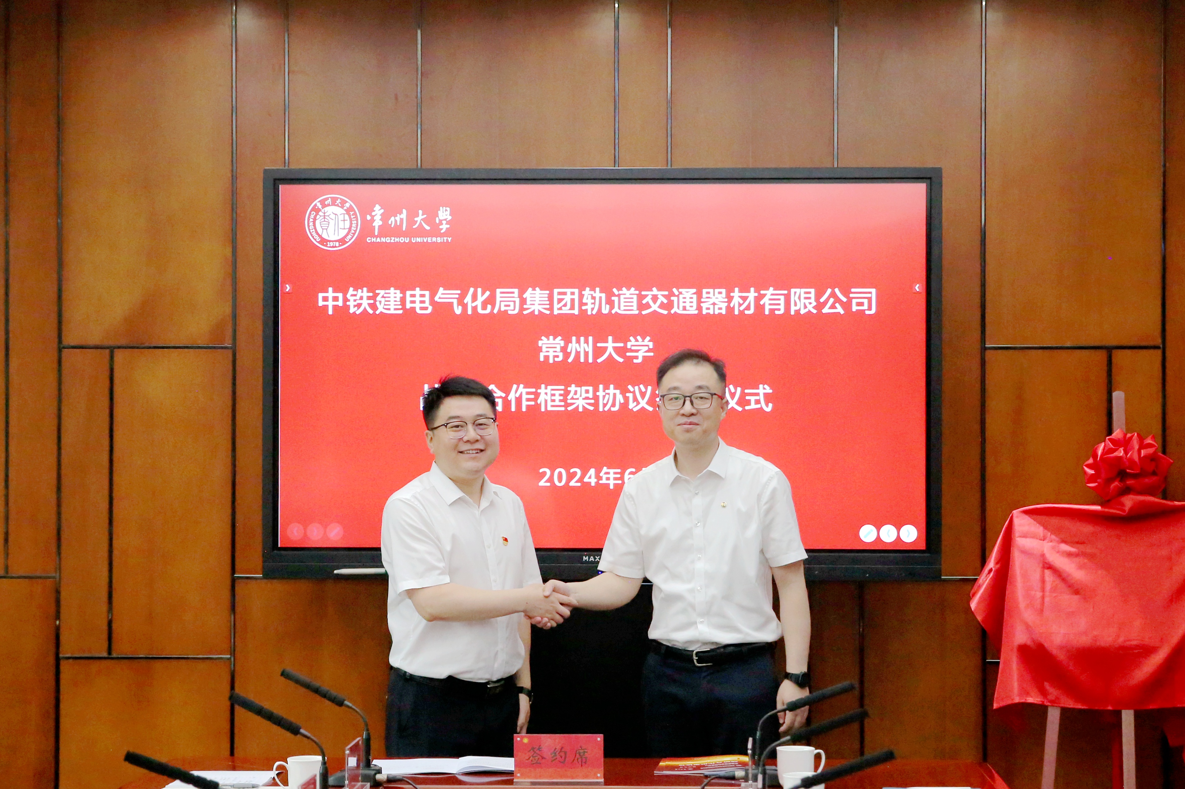 6月12日上午,中铁建电气化局集团轨道交通器材有限公司(以下简称“轨道器材公司”)与常州大学战略合作框架协议签约仪式在我校举行。中铁建电气化局集团有限公司党委委员、副总经理孟宪浩,副总工程师赵德胜,轨道器材公司党委书记、执行董事刘如久,党委副书记、总经理储文平,常州大学党委副书记、校长陈海群,党委常委、副校长周刚出席签约仪式。轨道器材公司和学校相关部门、学院负责人参加签约活动。