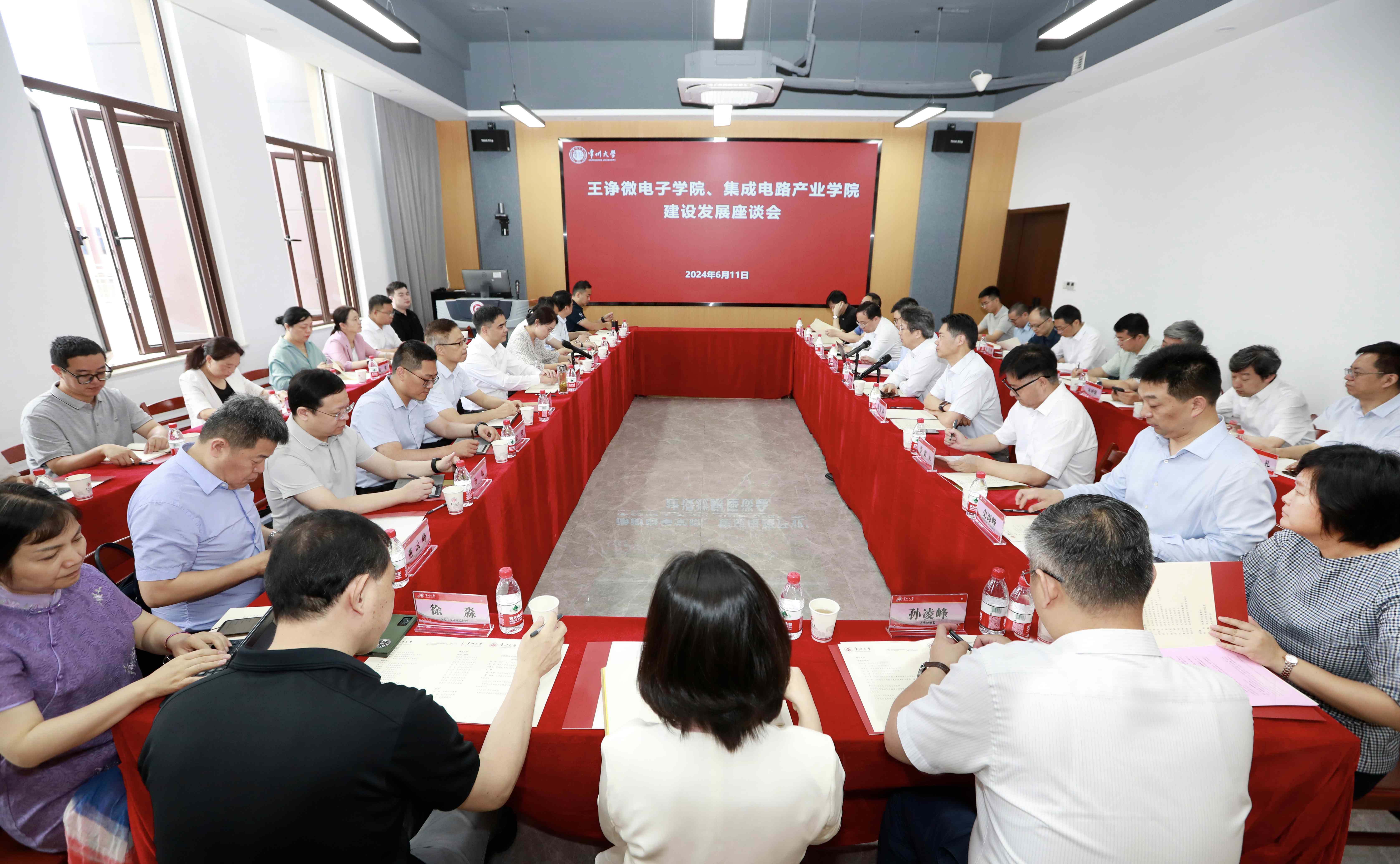 6月11日上午,武进区人民政府区长恽淇丞、副区长王斐,武进国家高新区管委会副主任恽益明,武进区政府办公室、组织部、科技局、财政局、人社局、商务局、武高新、国经集团等主要负责人,纵慧芯光董事长赵励、承芯半导体副总经理徐淼、武岳峰科创副总裁郑凯等一行来校调研指导。常州大学党委书记徐守坤,党委副书记、校长陈海群,副校长王建浦,党委常委、副校长李忠玉出席会议,党办校办、组织部、发展规划处、人事处、教务处、学科建设办公室、科技处、产学研合作处、计划财务处等负责人,王诤微电子学院领导班子及教师代表参加会议。陈海群主持会议。