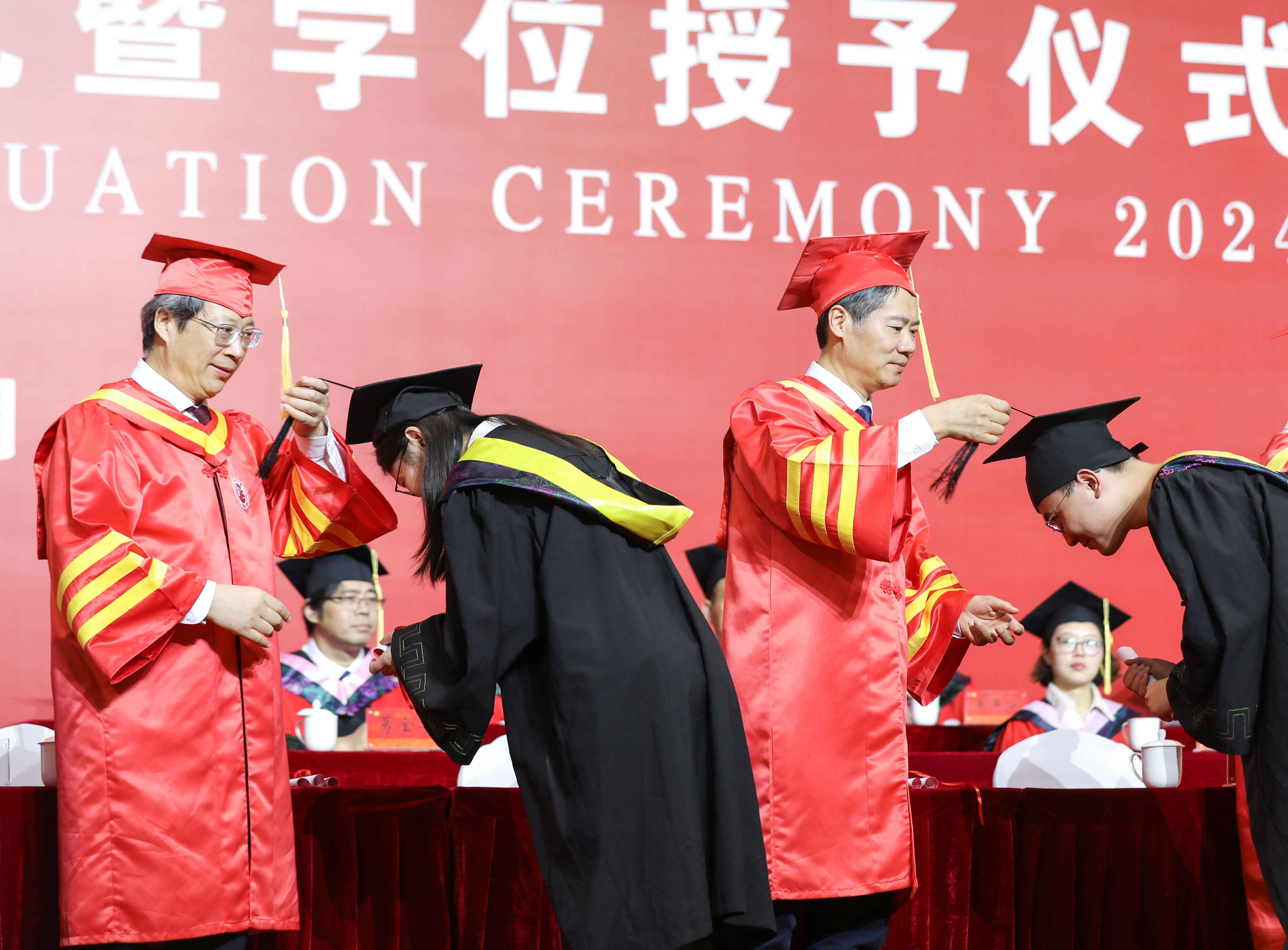 校领导为2024届省优秀毕业生代表、校优秀毕业生研究生代表、校本科生优秀毕业生标兵和优秀毕业生代表颁发证书,并为2024届毕业研究生代表、本科生代表拨正流苏、授予学位。