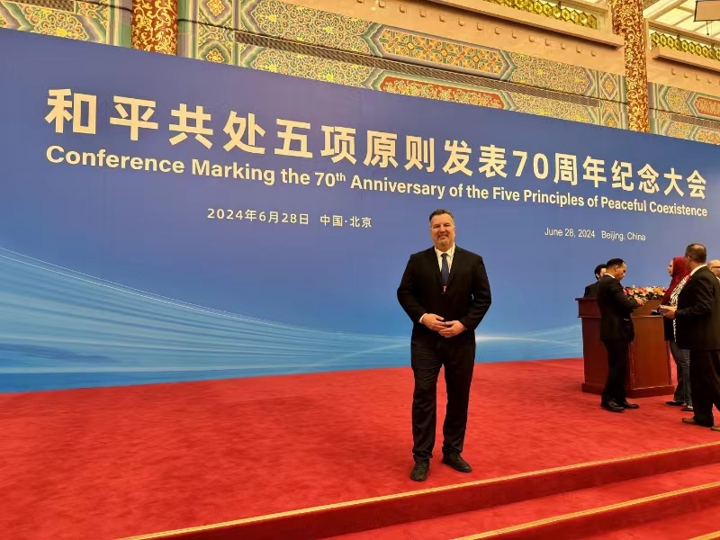 6月28日,我校外国语学院西班牙语专业教师、校拉丁美洲研究中心副主任斯蒂文博士(Esteban Zottele)应邀参加在北京人民大会堂举行的和平共处五项原则发表七十周年纪念大会,并在当日下午举行的分论坛中发言。纪念大会由李强总理主持,习近平主席出席纪念大会并发表题为《弘扬和平共处五项原则,携手构建人类命运共同体》的重要讲话,中共中央政治局委员、外交部长王毅出席在钓鱼台国宾馆举办的午餐会并致辞。多国政要,中共中央、全国人大、国务院、全国政协等有关部门负责人,国际和地区组织代表、来自一百多个国家的驻华使节、中外专家学者、友好人士、媒体和工商界代表约600余人参加纪念大会。