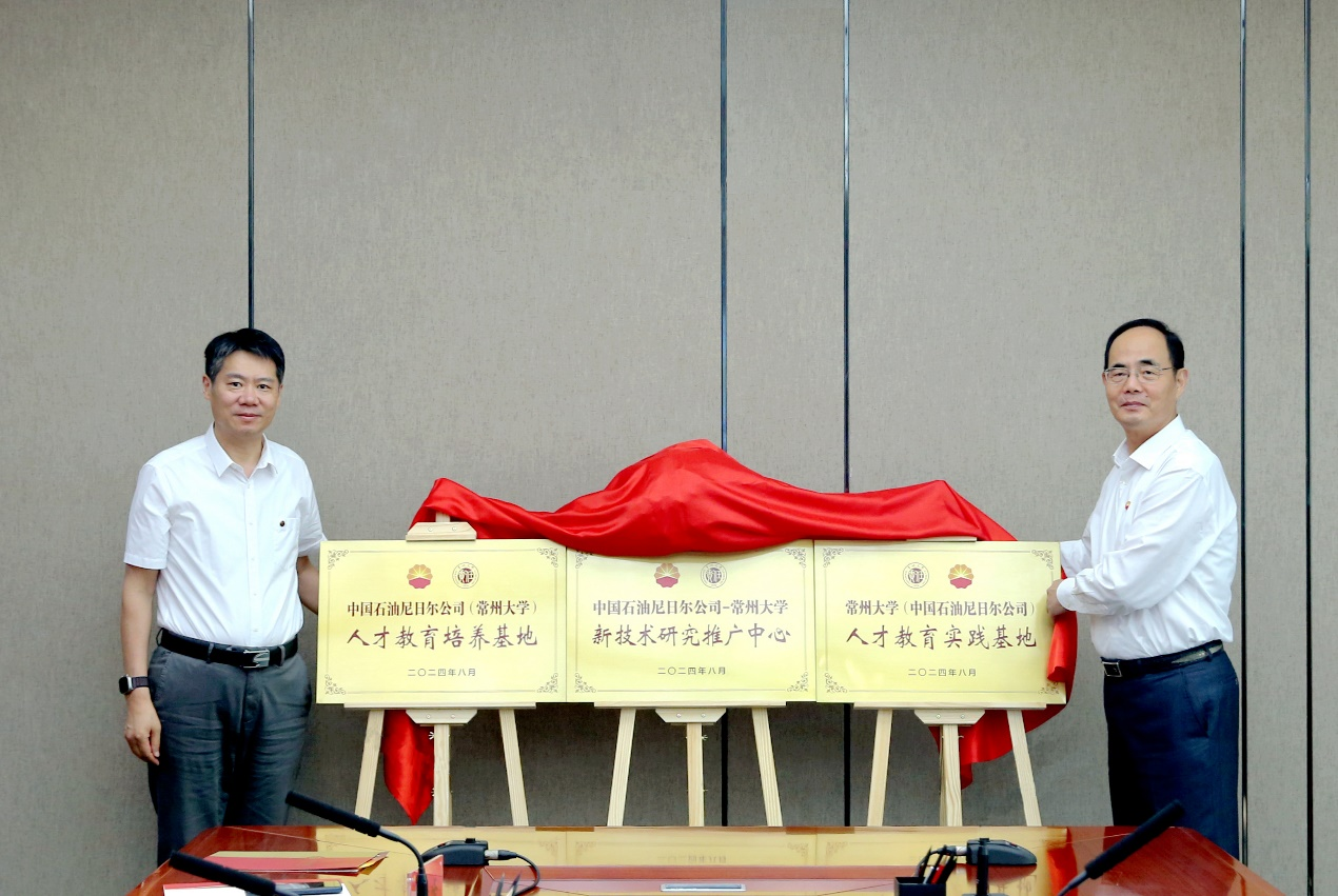 9月5日,中国石油尼日尔公司(以下简称“尼日尔公司”)—常州大学“一中心(新技术研究推广中心)、两基地(人才教育培养基地、人才教育实践基地)”揭牌仪式在常州举行。尼日尔公司党委书记、总经理周作坤,人力资源部主任武昌,生产部副主任成勇,中国石油技术开发公司(以下简称“中油技开”)首席专家薛晓虎,常州大学党委副书记、校长陈海群,副校长晏成林,以及常州大学相关职能部门、学院负责人和教师代表参加会议。晏成林主持会议。