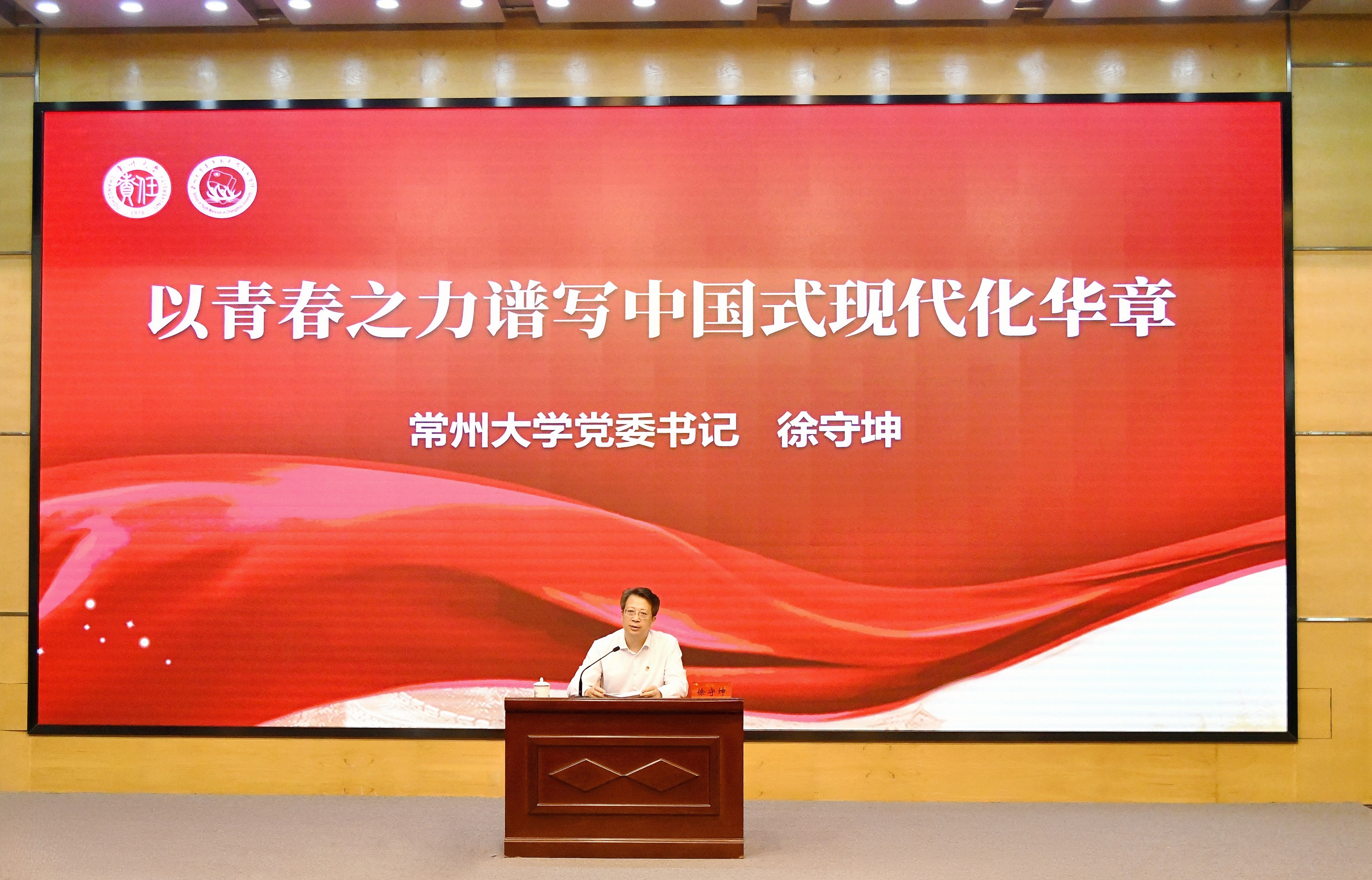 徐守坤以“以青春之力谱写中国式现代化华章”为主题,讲授开班第一课。徐守坤从中国式现代化的本质谈起,提出以中国式现代化推进中华民族伟大复兴是当代中国最大的政治,要立足时代脉络,站位高远把握中国式现代化。他结合常州大学办学历史和发展成就,鼓励青年学生牢记“责任”校训,积极践行青春使命,为中国式现代化挺膺担当。他强调,青年学生要有理想,胸怀大志、心怀祖国,坚定信仰补好精神钙;强本领,深耕专业、善于创新,精益求精做好排头兵;肯奋斗,不畏艰苦、迎难而上,脚踏实地走好青春路。他希望全体青马学员肩负起历史重任,在中国昂扬向前的时代奔流中,在中国式现代化和教育强国建设新征程中,奋力谱写常大青年的绚丽篇章!