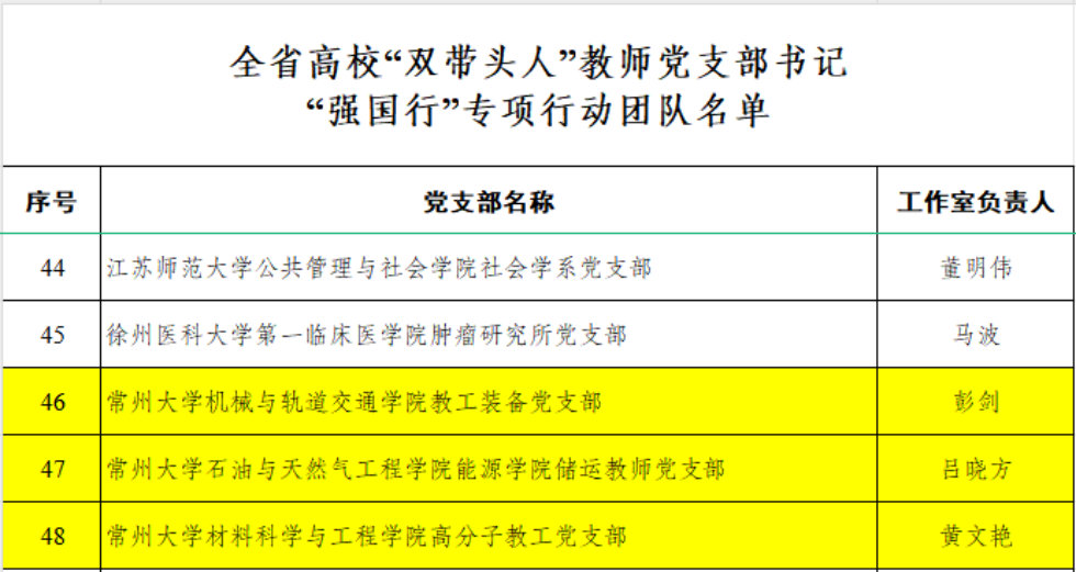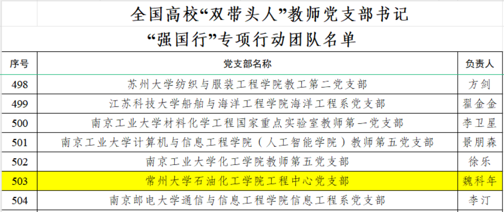 近日,教育部办公厅、省委教育工委分别公布了全国、全省高校“双带头人”教师党支部书记“强国行”专项行动团队名单。我校石油化工学院工程中心党支部成功入选全国高校“双带头人”教师党支部书记“强国行”专项行动团队;机械与轨道交通学院教工装备党支部,石油与天然气工程学院能源学院储运教师党支部和材料科学与工程学院高分子教工党支部入选全省高校“双带头人”教师党支部书记“强国行”专项行动团队。