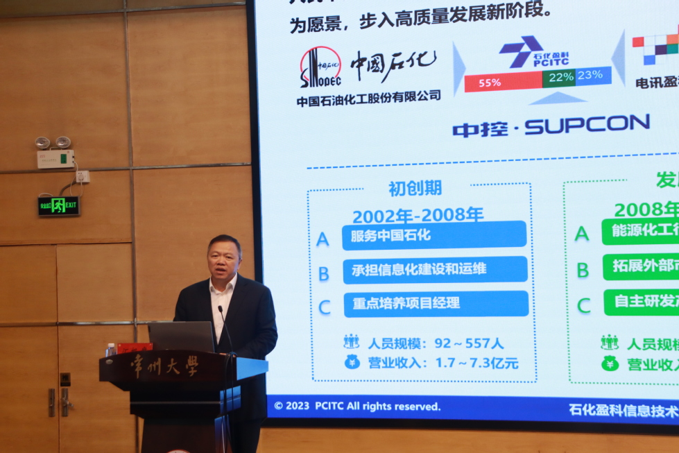 11月1日下午,能源行业智能化前沿技术报告会在常州大学科教城校区文彰楼报告厅举行。石化盈科信息技术有限责任公司党委委员、副总裁张刘军,副总经济师、党委组织部部长、人力资源部总经理徐立盛,科技信息部总经理李永峰,华东区域(上海)分公司兼过程控制事业部总经理王建平,华东区域(南京)分公司总经理(南京)焦云强,智能制造研发中心总经理温小艳,过程控制事业部总经理助理陈玉石,过程控制事业部高级顾问司翔宇,常州大学教务处、产学研合作处、能源化工行业创新处、石油化工学院、阿里云大数据学院相关负责人及师生代表200余人参加报告会。阿里云大数据学院院长石林主持报告会。