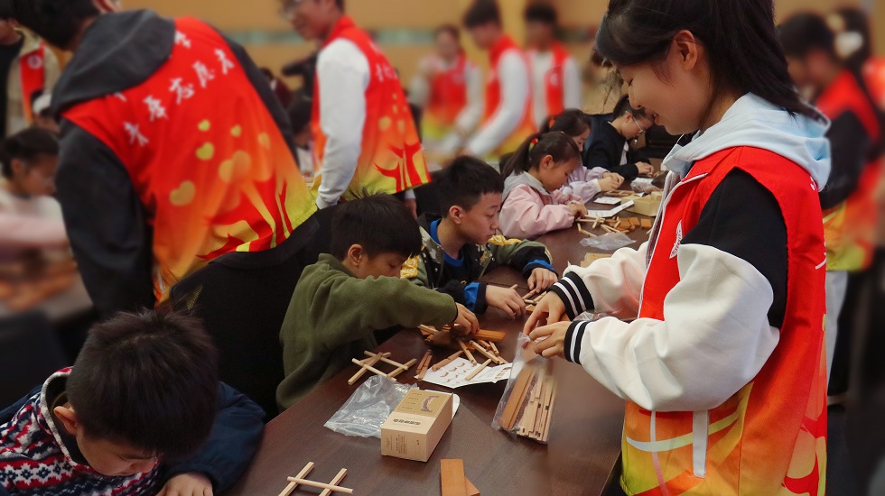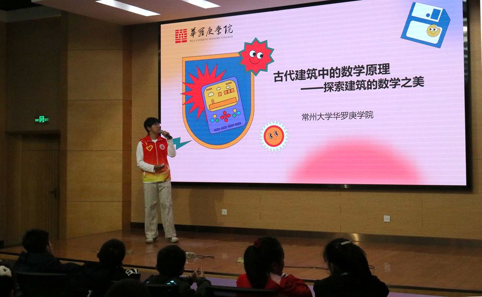 签约仪式结束后,院学生志愿者为华罗庚实验学校的小学生们开展了数学科普活动。志愿者用通俗易懂的语言讲解了古代知名建筑中的数学原理,并指导现场的同学们搭建了鲁班桥模型,让同学们感受建筑中的对称美,理解比例关系对于建筑稳定性的作用。互动环节过后,志愿者联系日常生活中的智能产品介绍了数学研究与数学应用的新方向,激发同学们对数学的兴趣与热爱。