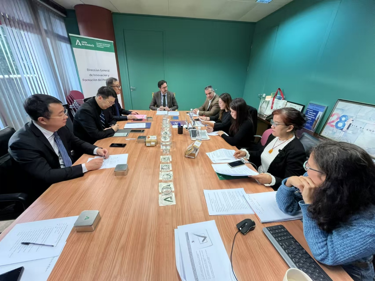 访问西班牙安达卢西亚大区教育厅期间,安区教育厅创新与教师培训部司长弗朗西斯科·哈维尔,安区教育厅国际项目服务处处长兼安区孔子课堂外方院长帕特里克·洛佩兹一行会见了我校代表团。周刚指出,常州大学安区孔子课堂经过多年的合作发展,中文项目已纳入安区国民教育体系中,覆盖45所中小学校,学习中文的学员人数累计4万余人,已成为欧洲规模最大的孔子课堂。哈维尔表示,国际中文项目是安区中小学的特色项目,安区教育厅将会继续支持安区课堂中文教育的开展。会见中,双方还召开了2024年度安区孔子课堂理事会和2025年工作会议。会后,代表团还走访祖尼加小学孔子课堂教学点,并以中国大运河为主题举办了一堂文化讲座。