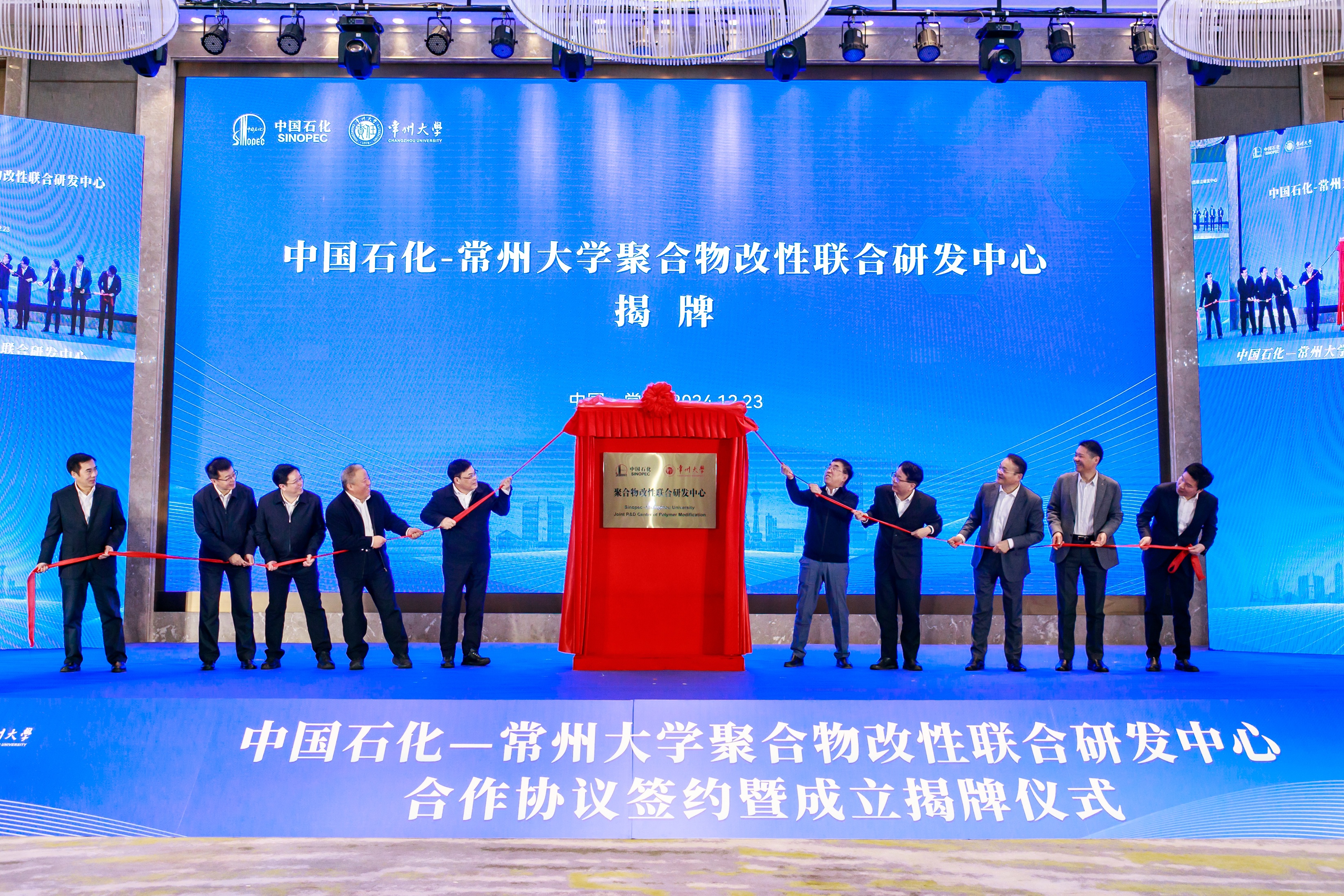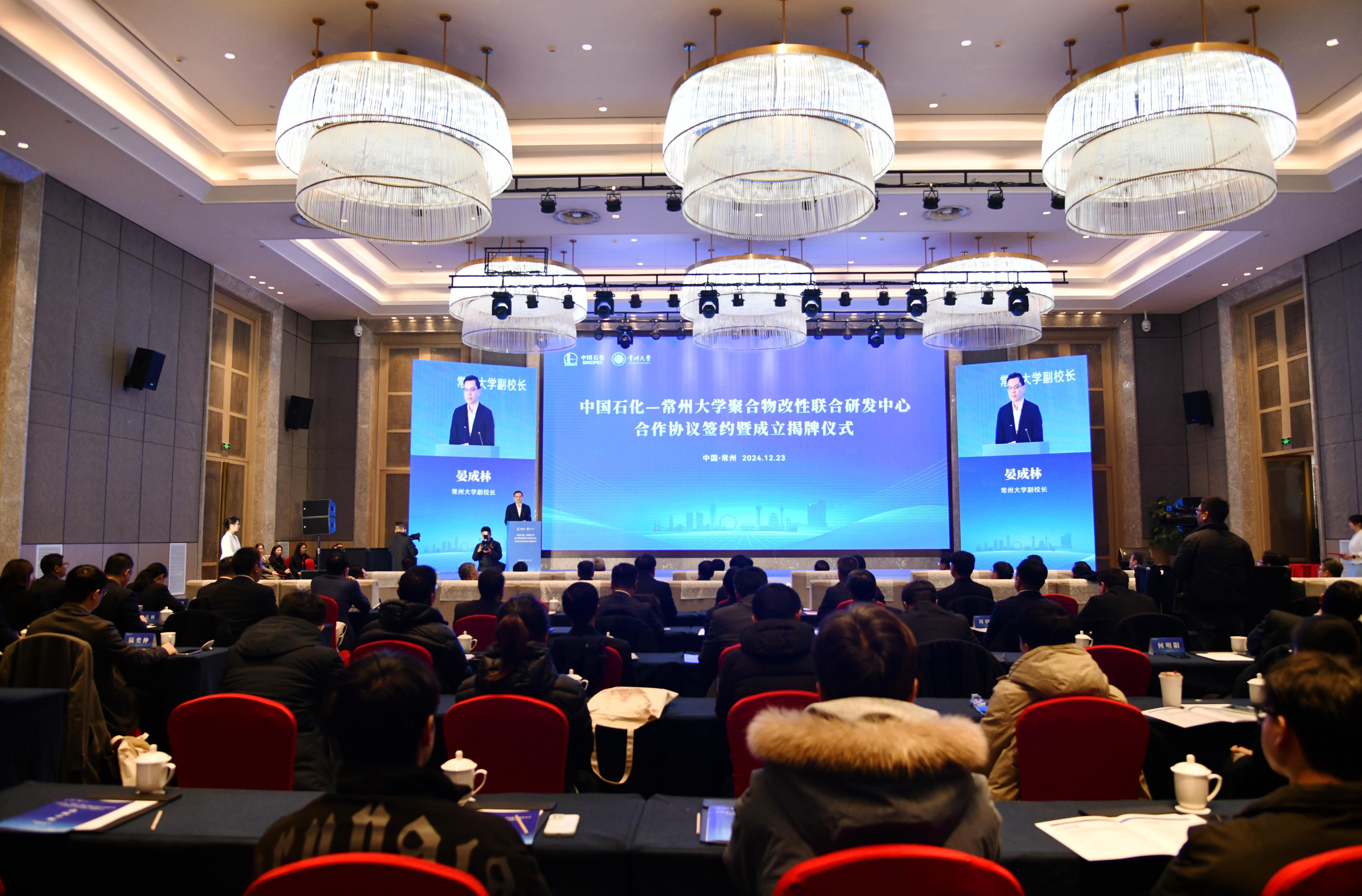 12月23日,中国石化—常州大学聚合物改性联合研发中心(简称“联合研发中心”)合作协议签约暨成立揭牌仪式在常州举行。中国工程院院士谢克昌,中国石油化工集团有限公司党组成员、副总经理、股份公司高级副总裁李永林,科技部总经理卞凤鸣,综合管理部副主任、党组办公室副主任钟文标,化工事业部副总经理王立东,化工销售江苏分公司总经理李楚新,扬子石化副总经理刘文豹,化工销售公司副总经理钱斌,北京化工研究院副院长高达利,科技部集团首席专家庄毅等相关领导,常州市人民政府副市长蒋鹏举,武进区委常委、常州西太湖科技产业园党工委书记徐俊,常州大学党委副书记、校长陈海群,原党委书记陈群,党委常委、副校长李忠玉,党委常委、副校长彭明国,党委常委、副校长李亚飞,副校长晏成林出席会议,常州大学相关部门、学院负责人及教师代表参加会议。晏成林主持会议。