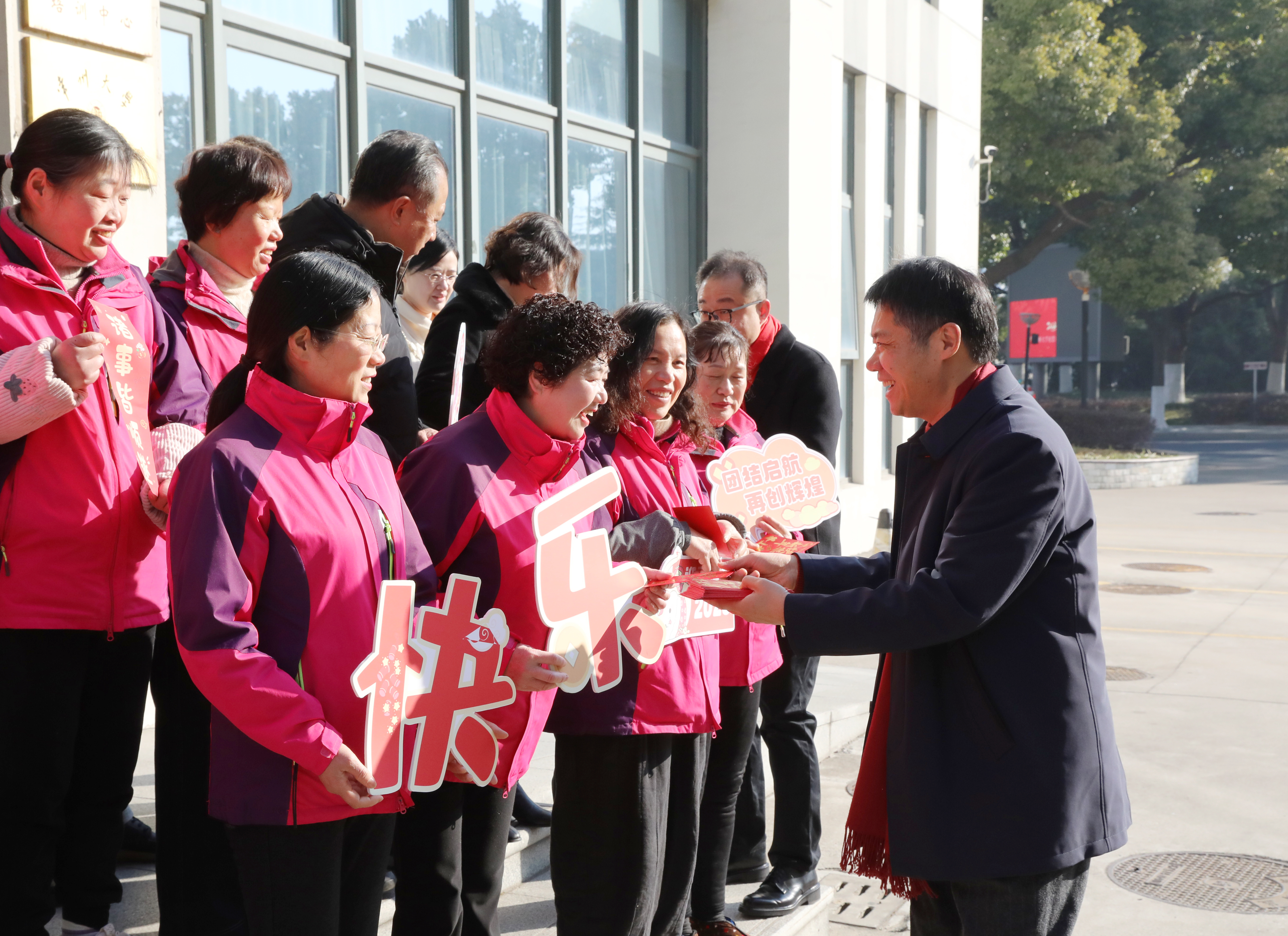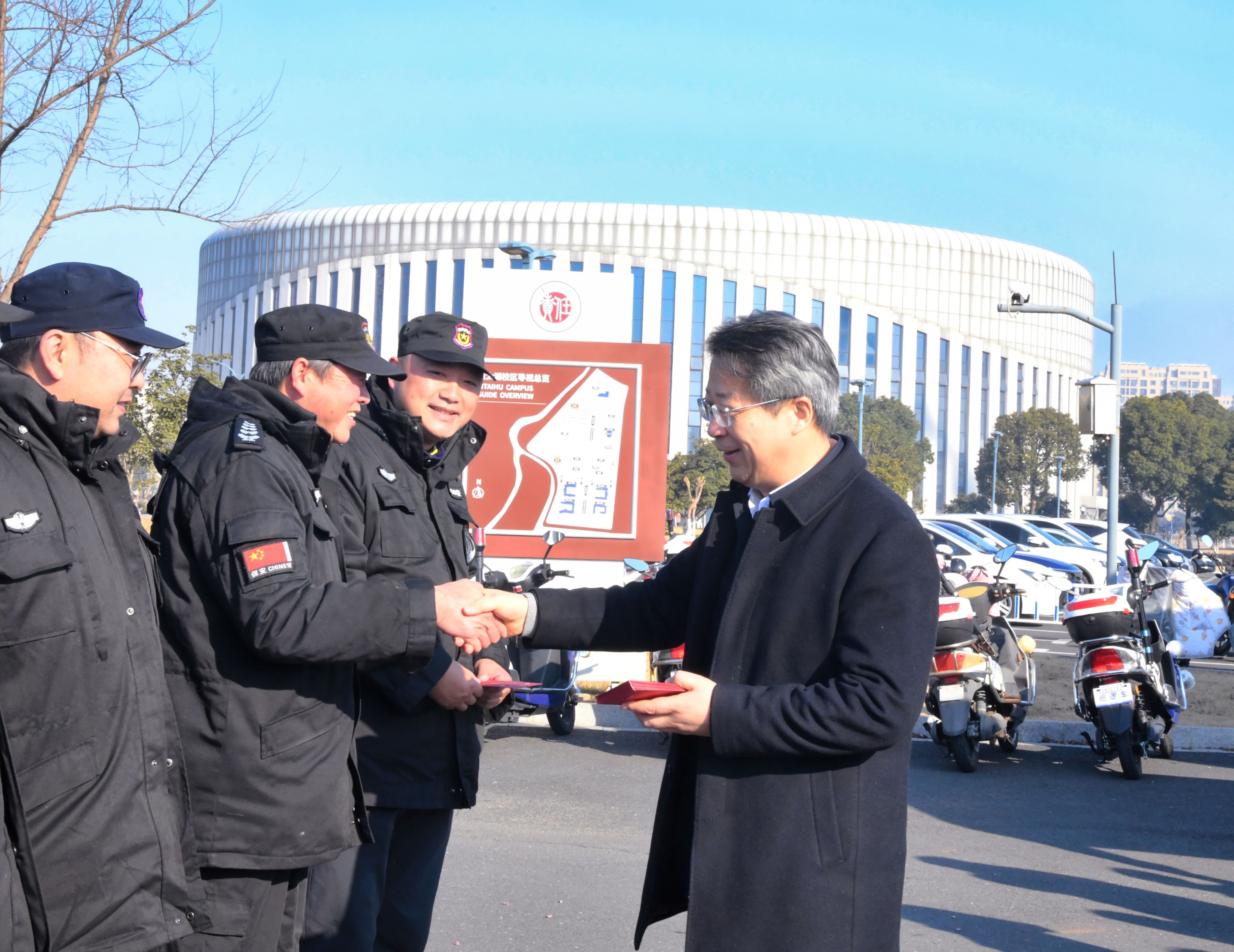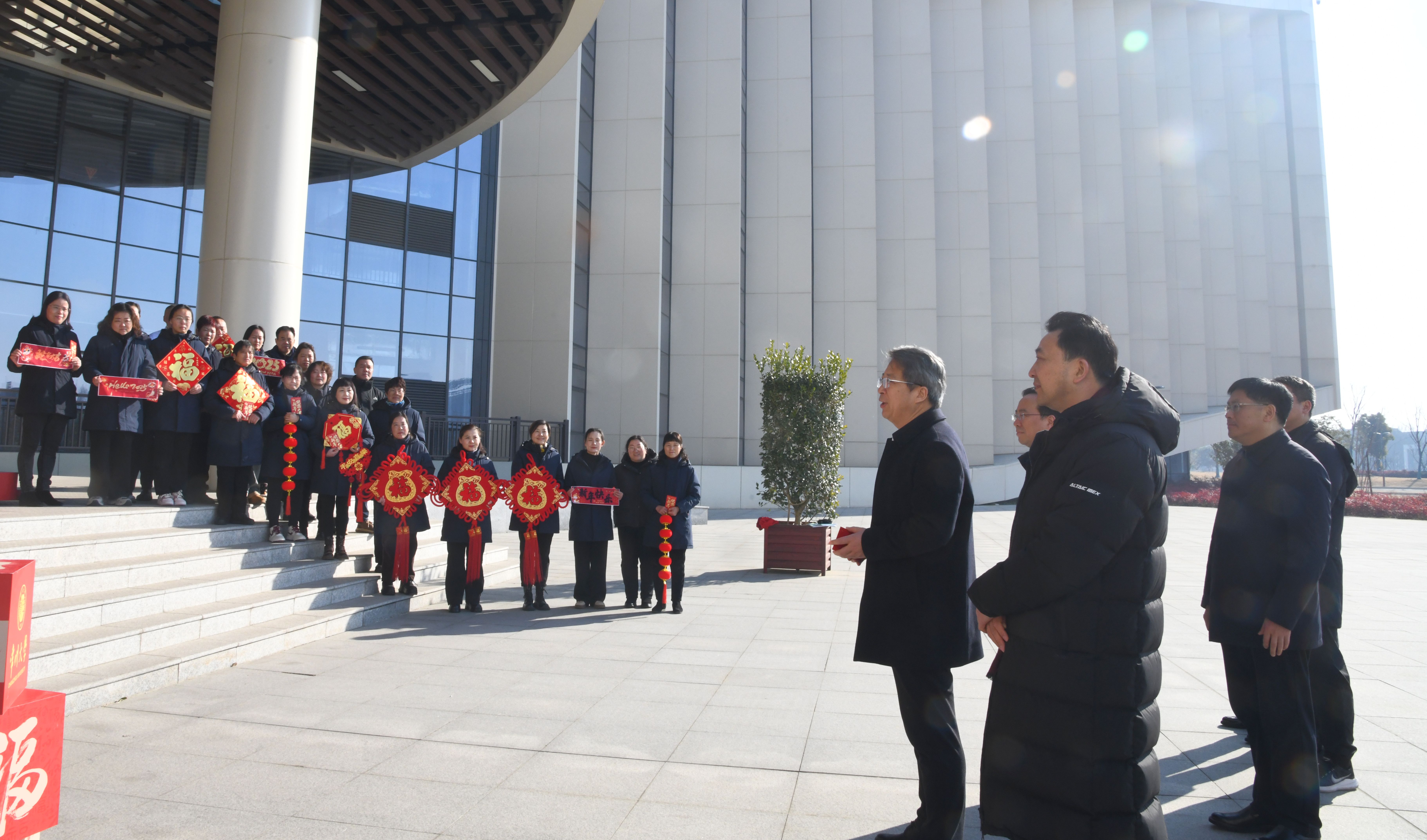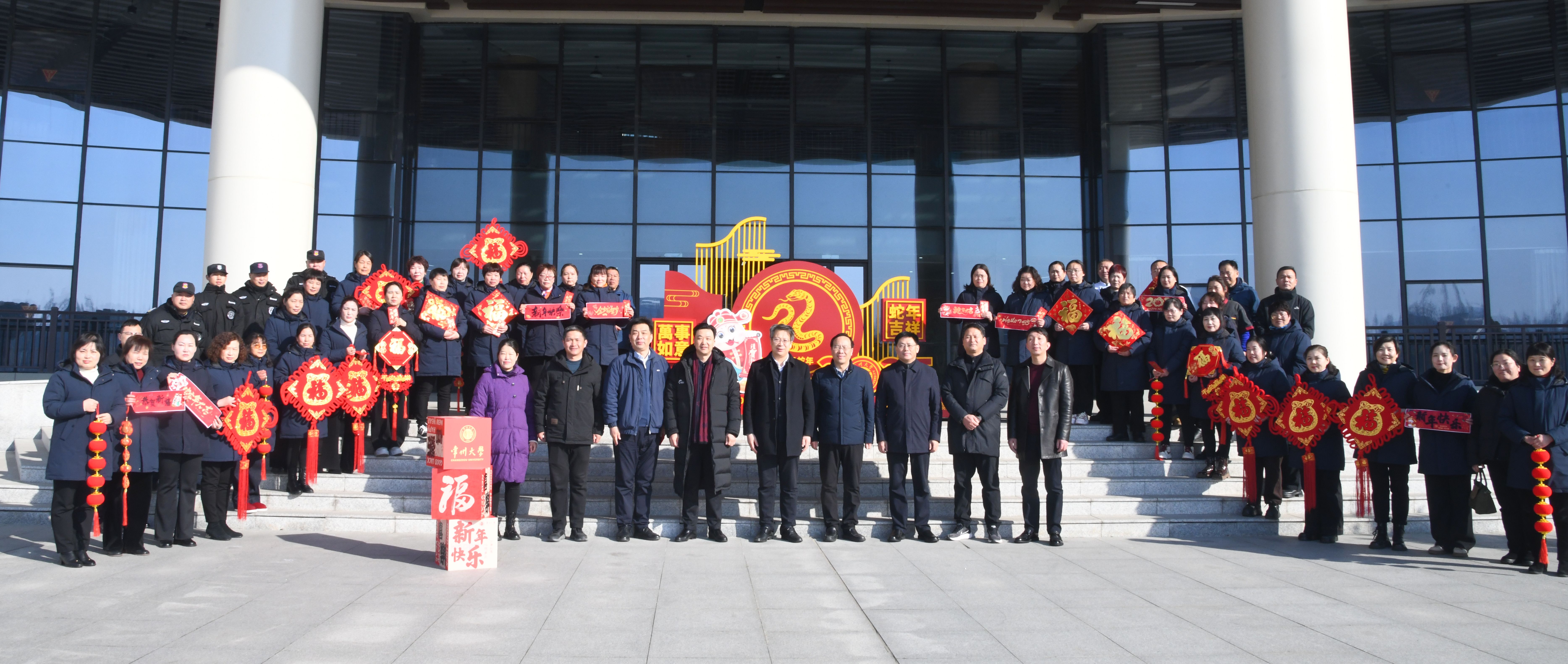 金蛇献瑞春光好,玉宇呈祥岁月新。正月初一上午,校党委书记徐守坤,党委副书记、校长陈海群带队看望慰问节日期间坚守岗位的教职工,并送上新春的祝福。党委常委、副校长周刚,党委常委、副校长彭明国,党委常委、组织部长秦义,党委常委、宣传部长薛冰陪同参加慰问。