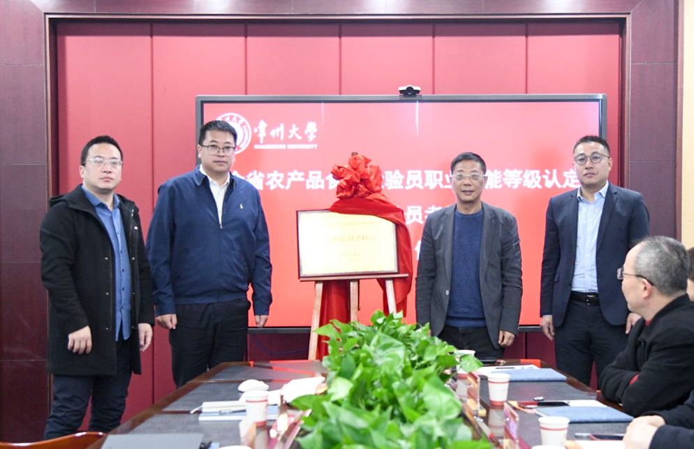 3月20日上午,江苏省食品检验员职业技能等级认定常州大学考点揭牌仪式在科教城校区药学院大楼204会议室举行。江苏省轻工协会副理事长、南京工业大学二级教授熊晓辉,常州大学党委常委、副校长李亚飞出席仪式,江苏省轻工协会秘书长张威、常州市市场监督管理局、农业农村局,以及常州大学培训中心、药学院相关负责人参加揭牌仪式。