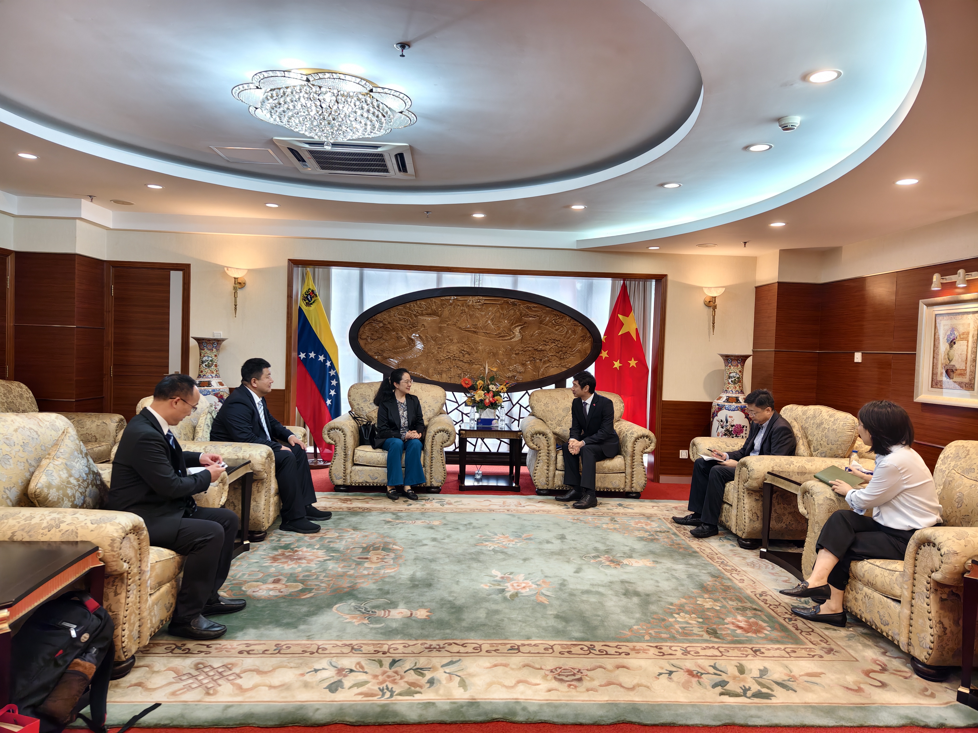 拜访中国驻委内瑞拉大使馆期间,中国驻委内瑞拉大使蓝虎一行会见了我校代表团。杨琳汇报了与常州大学在委孔子学院建设规划和发展思路,对大使馆在孔院建设中给予的大力支持表示感谢,并表示常州大学将一如既往地积极服务党和国家外交大局,与委内瑞拉高校开展务实合作。蓝虎表示,委内瑞拉是中国在拉美地区的重要伙伴,作为中国在委唯一的孔子学院,大使馆将继续支持常州大学孔子学院建设,为巩固和加强中委两国友好关系作出贡献。