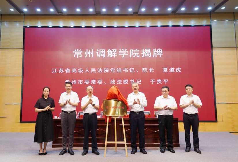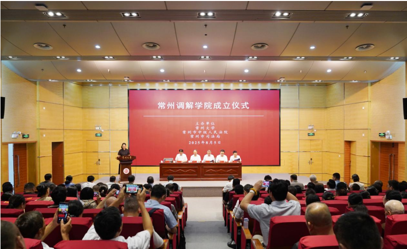 为深入贯彻习近平法治思想,坚持和发展新时代“枫桥经验”,建设高水平专业化调解员队伍,8月5日上午,常州调解学院成立仪式暨2025年人民调解员培训开班仪式在常州大学科教城校区文彰楼报告厅举行。省法院党组书记、院长夏道虎,常州市委常委、市委政法委员会书记于贵平出席仪式,市中级法院党组书记、院长曹忠明,常州大学党委副书记、校长陈海群,市司法局党组书记、局长陈跃峰致辞。省法院、市委政法委、市委社会工作部、市公安局、市检察院、市信访局、市法学会等相关领导,常州大学、法院系统、司法条线有关单位负责同志,人民调解员及新闻媒体代表参加活动。常州大学党委常委、副校长杨琳主持仪式。