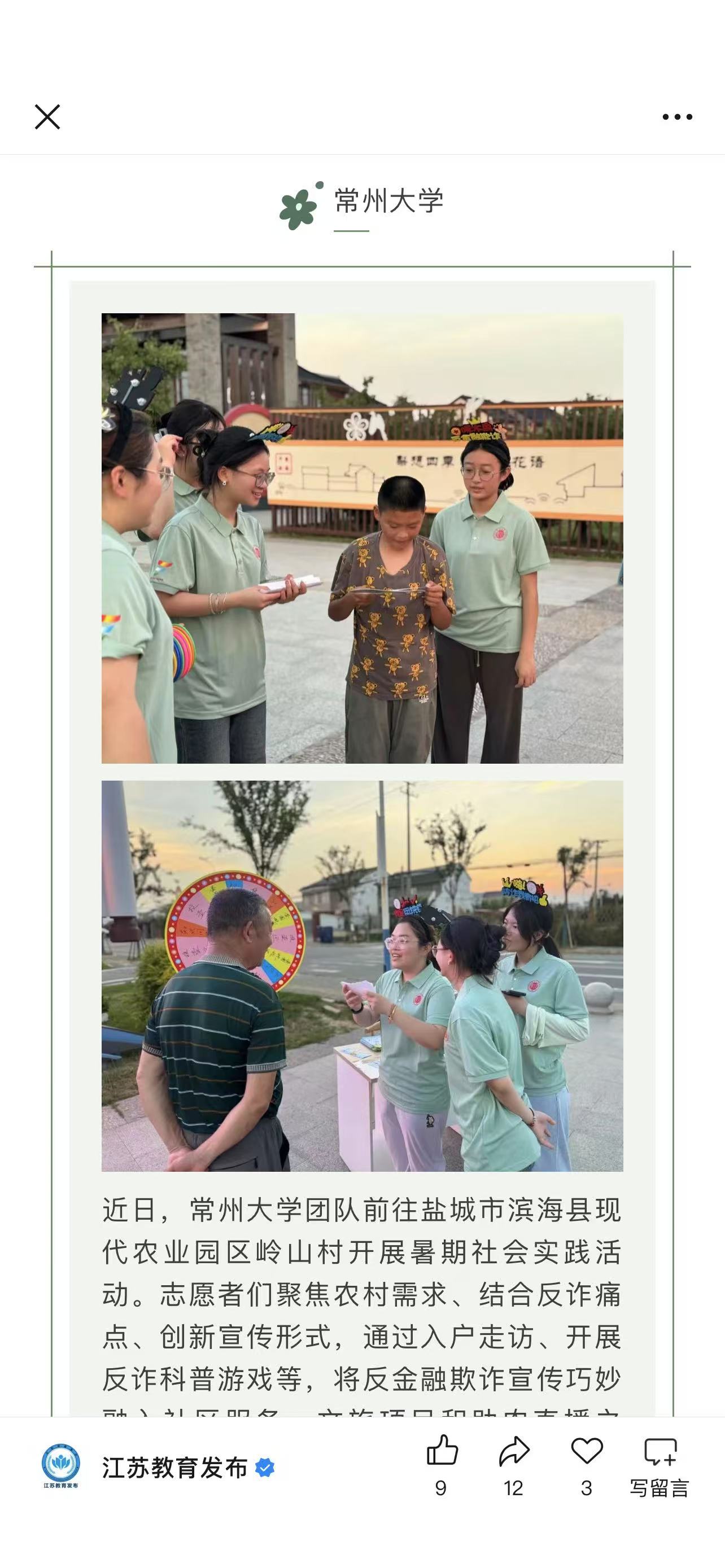 近日,常州大学团队前往盐城市滨海县现代农业园区岭山村开展暑期社会实践活动。志愿者们聚焦农村需求、结合反诈痛点、创新宣传形式,通过入户走访、开展反诈科普游戏等,将反金融欺诈宣传巧妙融入社区服务、文旅项目和助农直播之中,为当地居民送上实用、有趣的“安全防护课”。他们创新“反诈+”新模式,将专业知识转化为服务社会的实际行动,为提升乡村金融安全素养、护航乡村振兴贡献了青春智慧。