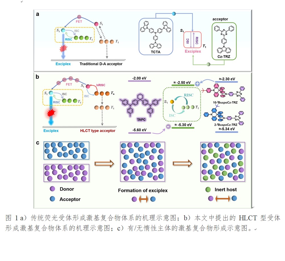 该研究论文首次提出以具有高激子利用率的杂化局域与电荷转移(HLCT)材料作为受体分子,成功构建出具有明显热活化延迟荧光特性的激基复合物体系,并实现了最大外量子效率为25.7%的溶液加工型OLED,且该器件表现出优异的稳定性在1000 cd/m²亮度下效率滚降仅为3.5%。该研究为发展高性能、低滚降的激基复合物材料体系提供了全新思路。